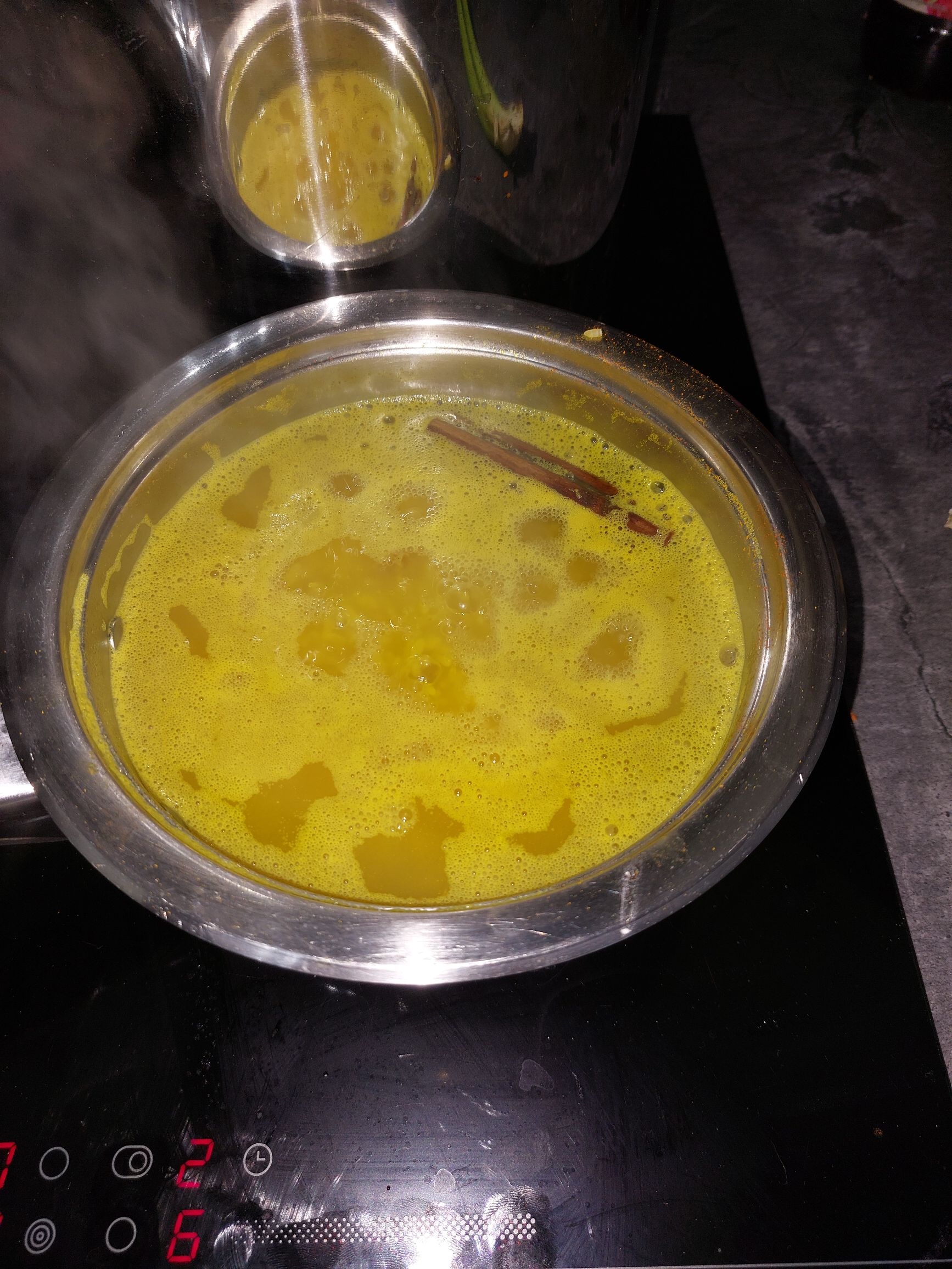 Riž speri pod vodo. V lonec daj: vodo, kurkumo, cimet, sladkor, sol. Zavri, nato dodaj riž in rozine. Kuhaj na nizkem ognju pokrito približno 12–15 minut, da riž vpije tekočino. Vmešaj maslo in razrahljaj z vilico.