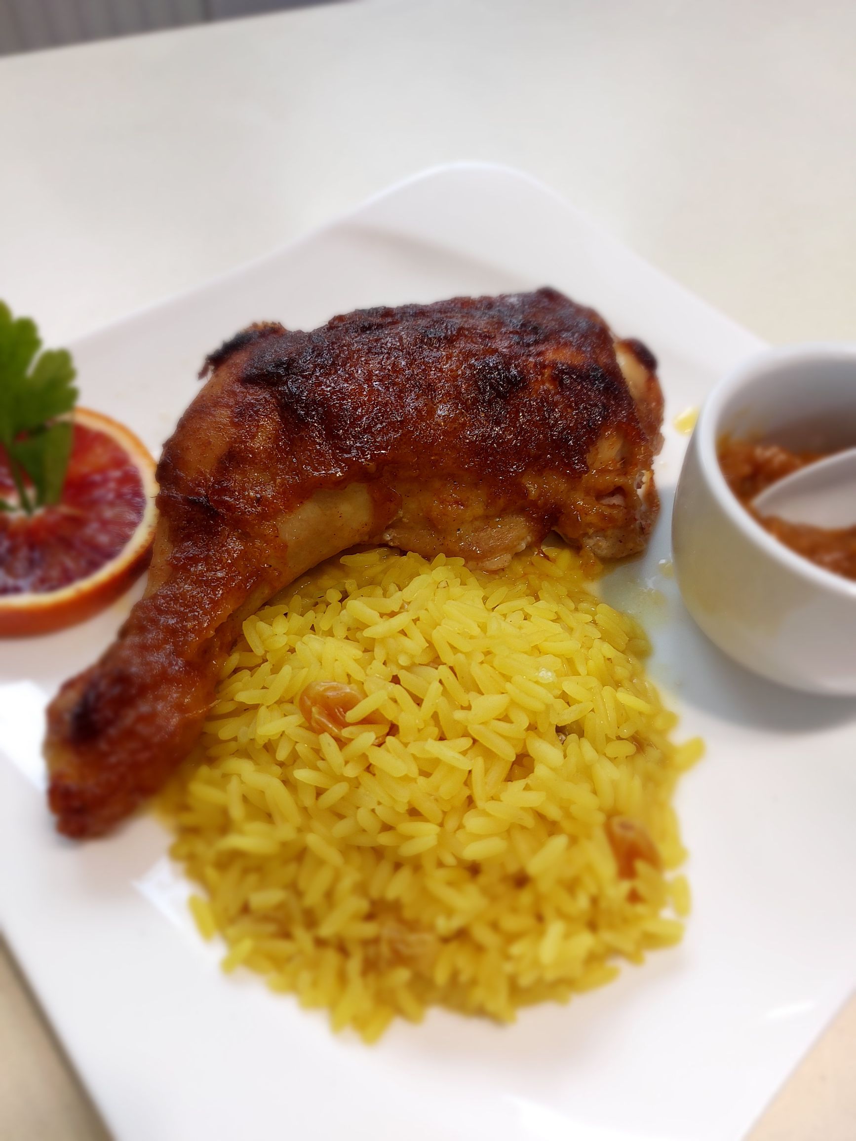 postrežemo z rumenim rižem z rozinami, dodatnim čatnijem, po želji pa še s pečeno zelenjavo in solato