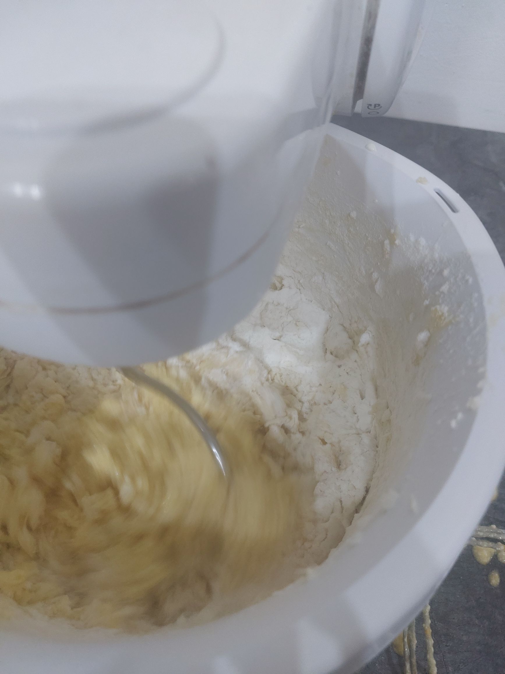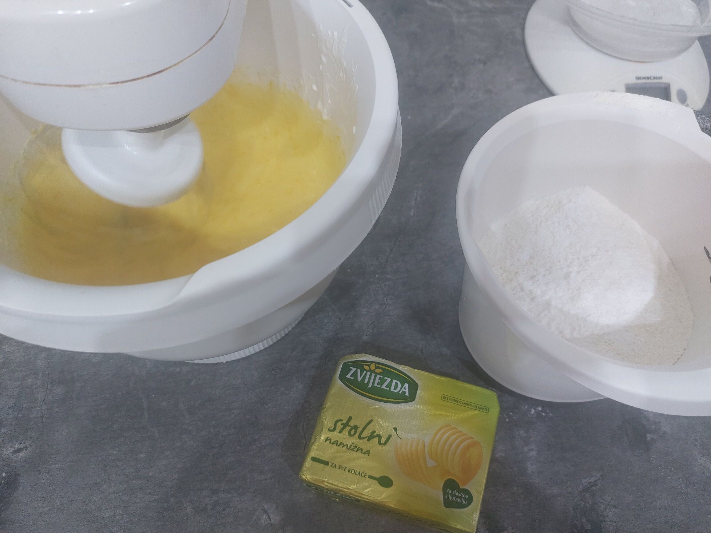med gnetenjem dodamo še moko, pecilni prašek in sol, vzamemo ven in še na roke dobro pregnetemo, zavijemo v prozorno folijo in damo v hladilni za 30 min