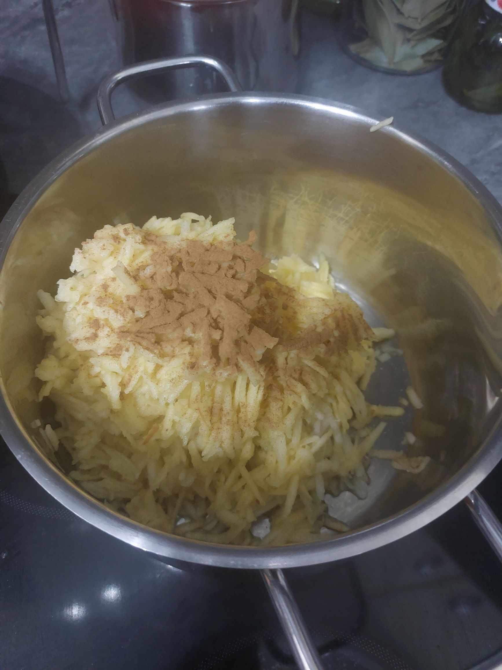 vmes pripravimo nadev; jabolka olupimo in naribamo, damo v kozico in dušimo cca 5 min da se zmehčajo, prelijemo z limoninim sokom, dobro premešamo, posujemo s cimetom, klinčki in sladkorjem, odstavimo in ohladimo