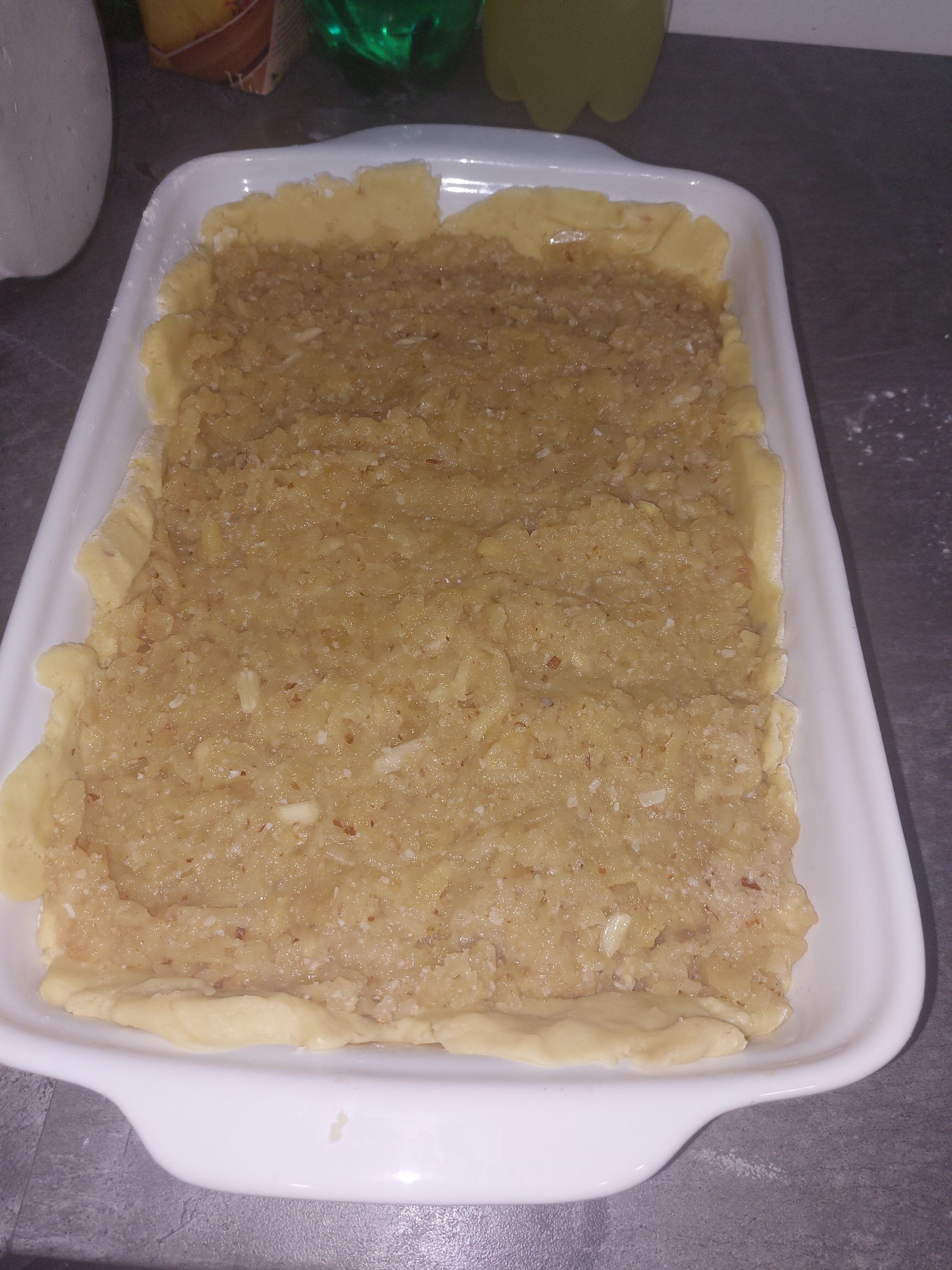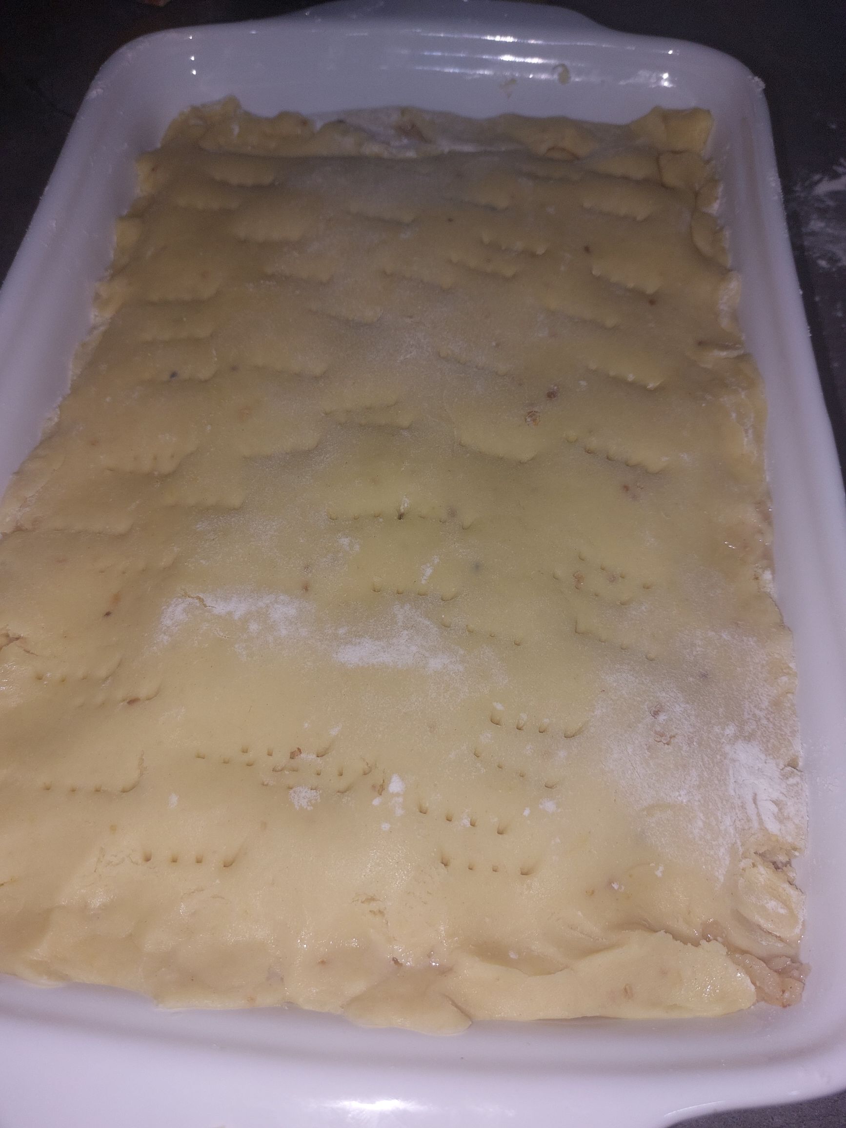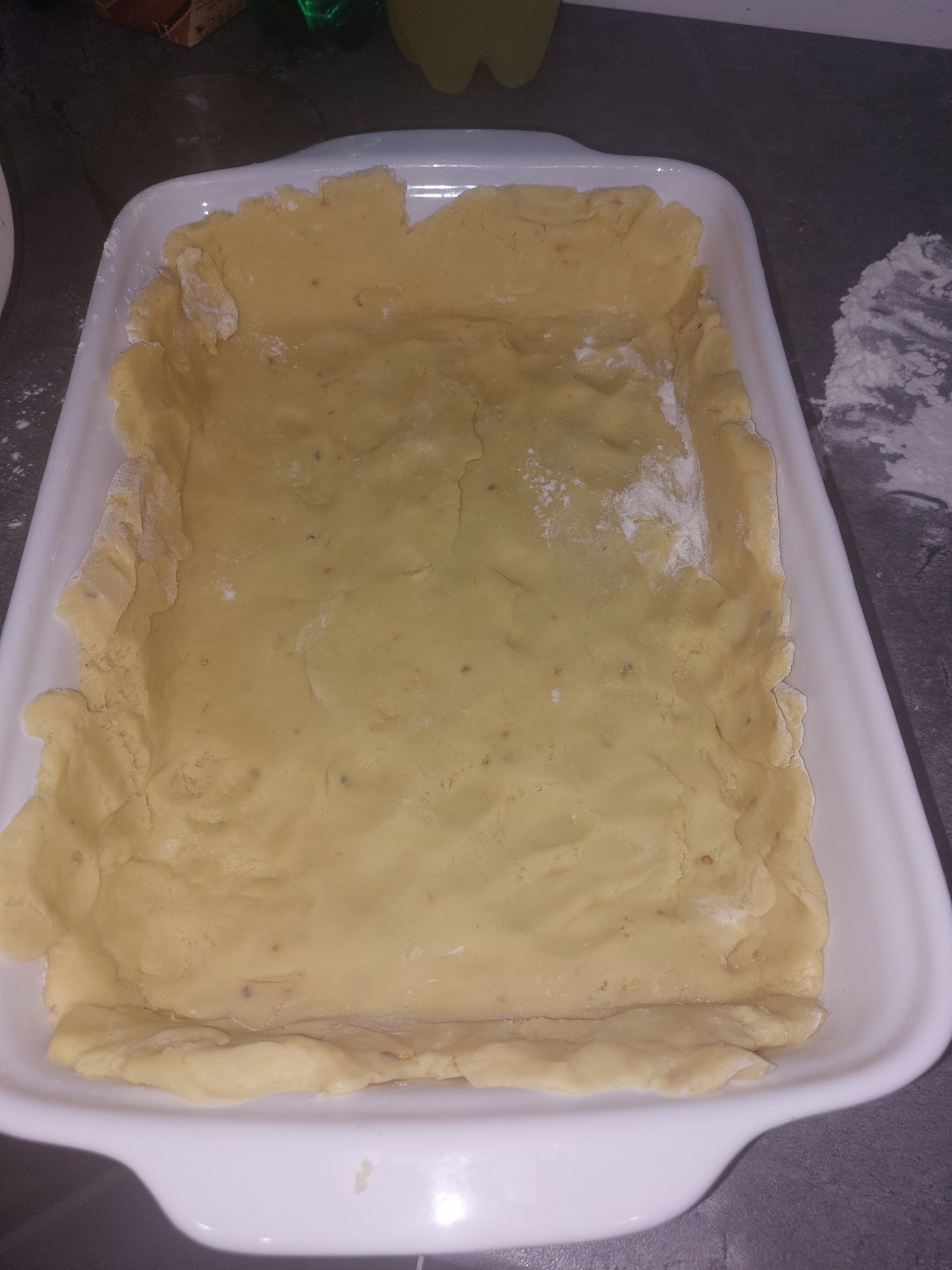 pečico priklopimo na 180°C, testo vzamemo iz hladilnika, ga rezdelimo na dva dela, pekač (25*30cm) namažemo z maslom ali pa obložimo s peki papirjem, testo na pomokani površini razvaljamo v velikosti pekača, damo v pekač, če se kje strga ga preprosto popravimo
