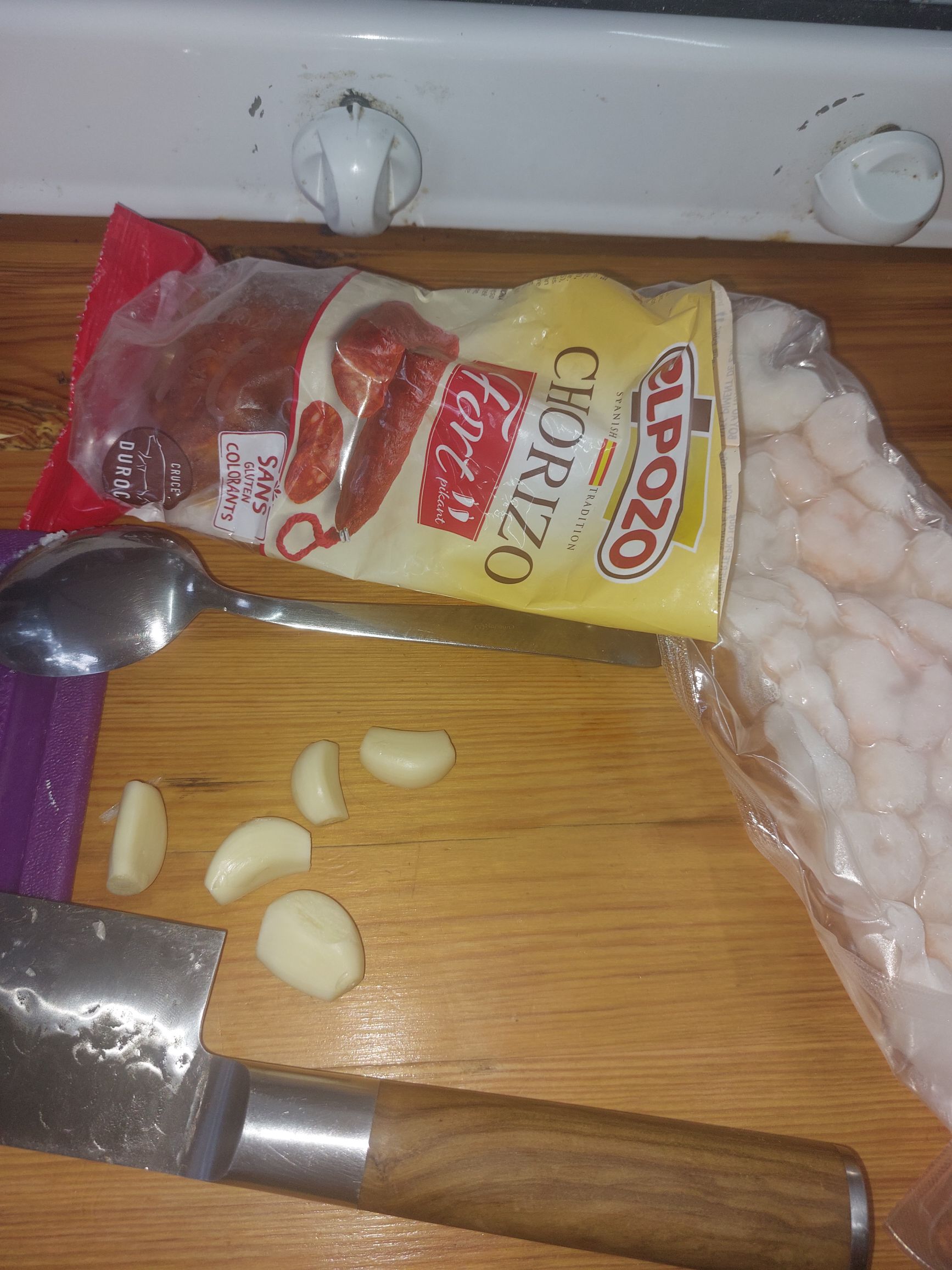 1. narežemo čorizo, če so kozice še zmrznjene jih hitro pokuhamo