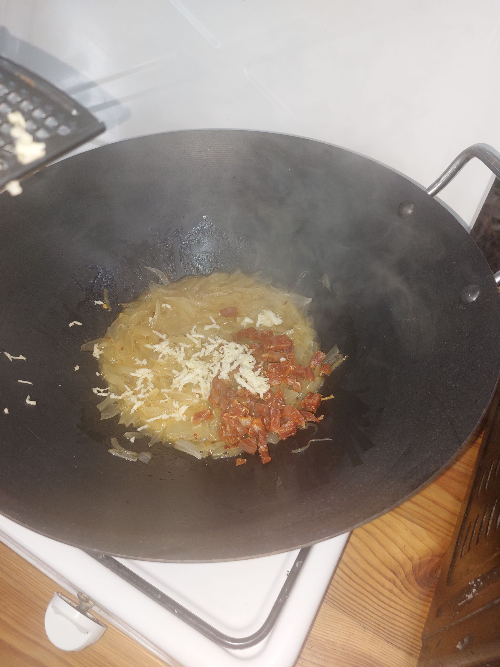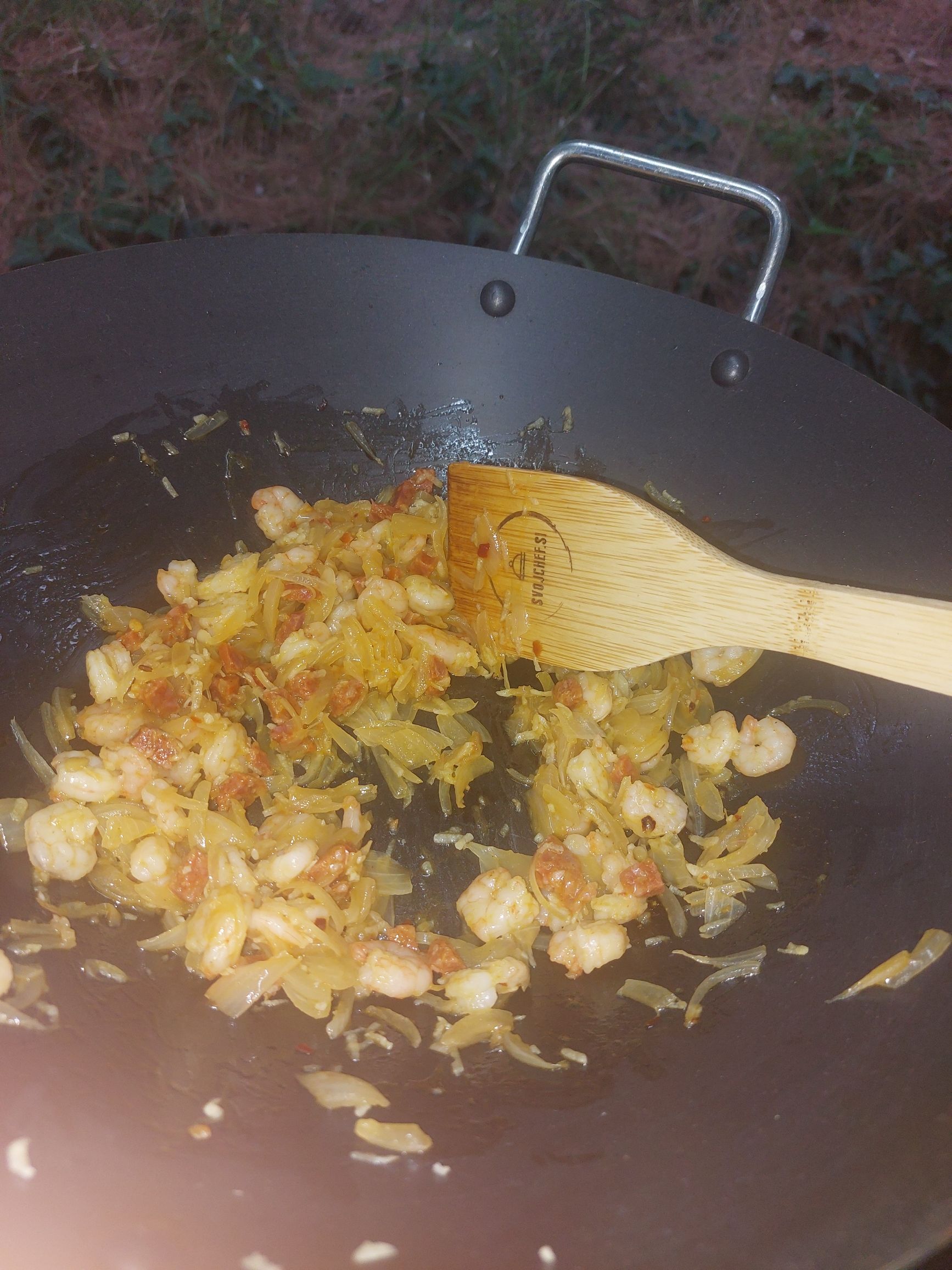 1. ko je čebula zmehčana, dodamo čorizo in nastrgan česen, hitro popražimo