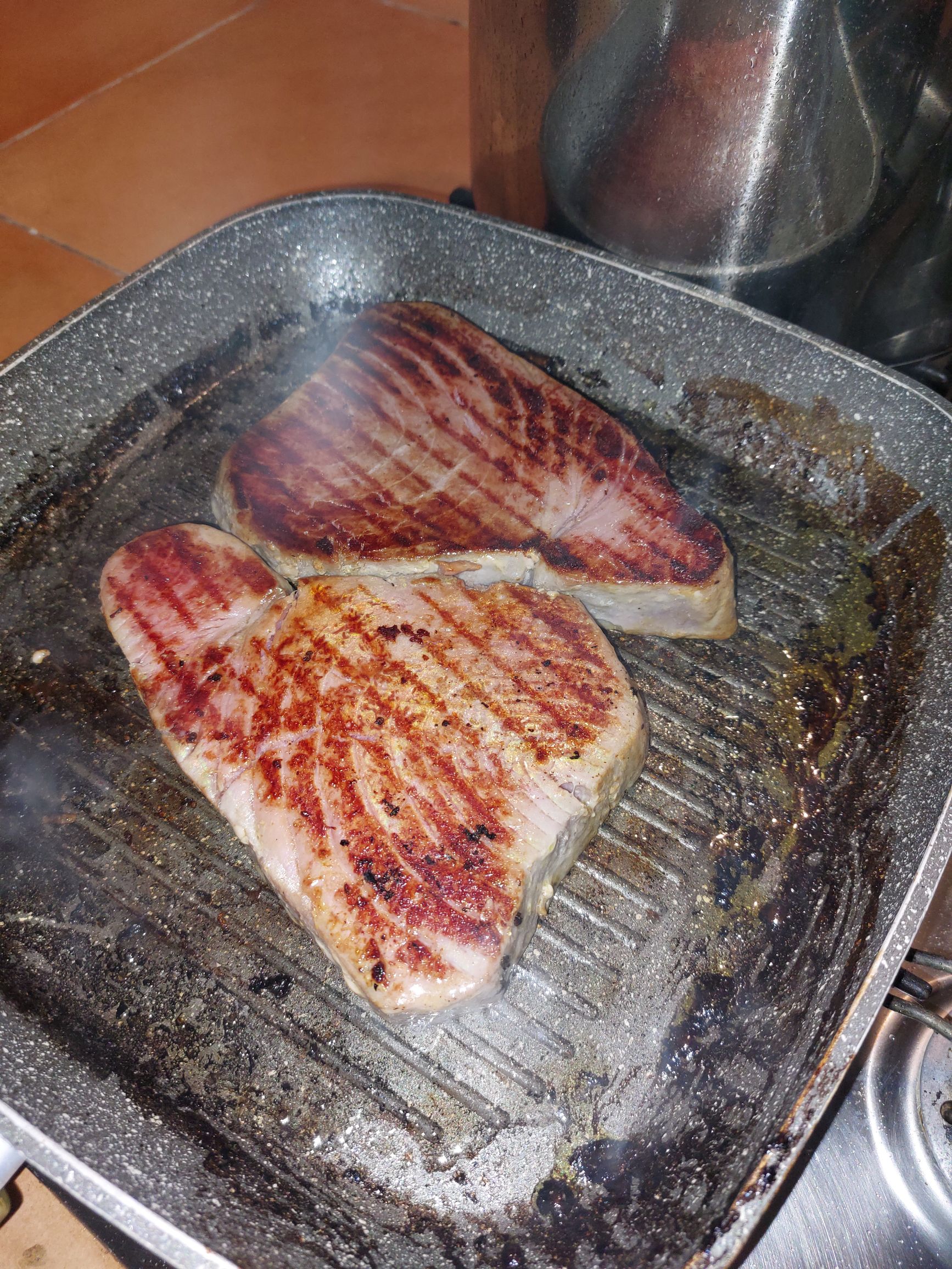 tunine zrezke na olju popečemo cca 4min na vsaki strani za medium, solimo, popramo, vzamemo ven