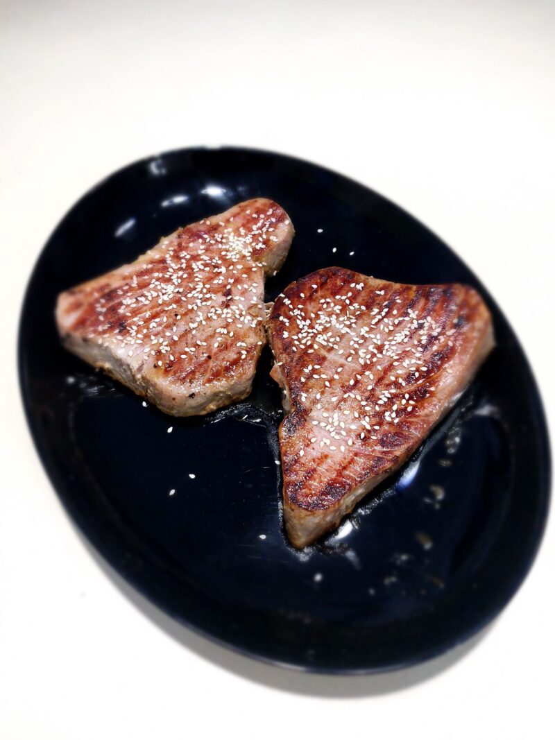 lahko pa popečene tunine zrezke po peki vzamemo ven in posujemo s praženim sezamom
