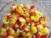 drobno narezano čebulo na olju pražimo, solimo, zalijemo z vinom, dodamo drobno nasekljano zeleno ( po želji kanček ingverja), pražimo, da vino povsem povre, dodamo na kocke narezan ananas, ga na hitro rahlo zapečemo, prilijemo pomarančni sok in limonin sok, omako povremo toliko da je še rahlo tekoča in ne marmeladasta, preveri okuse, po potrebi dodaj kanček sladkorja ali limone, sol, poper, čili