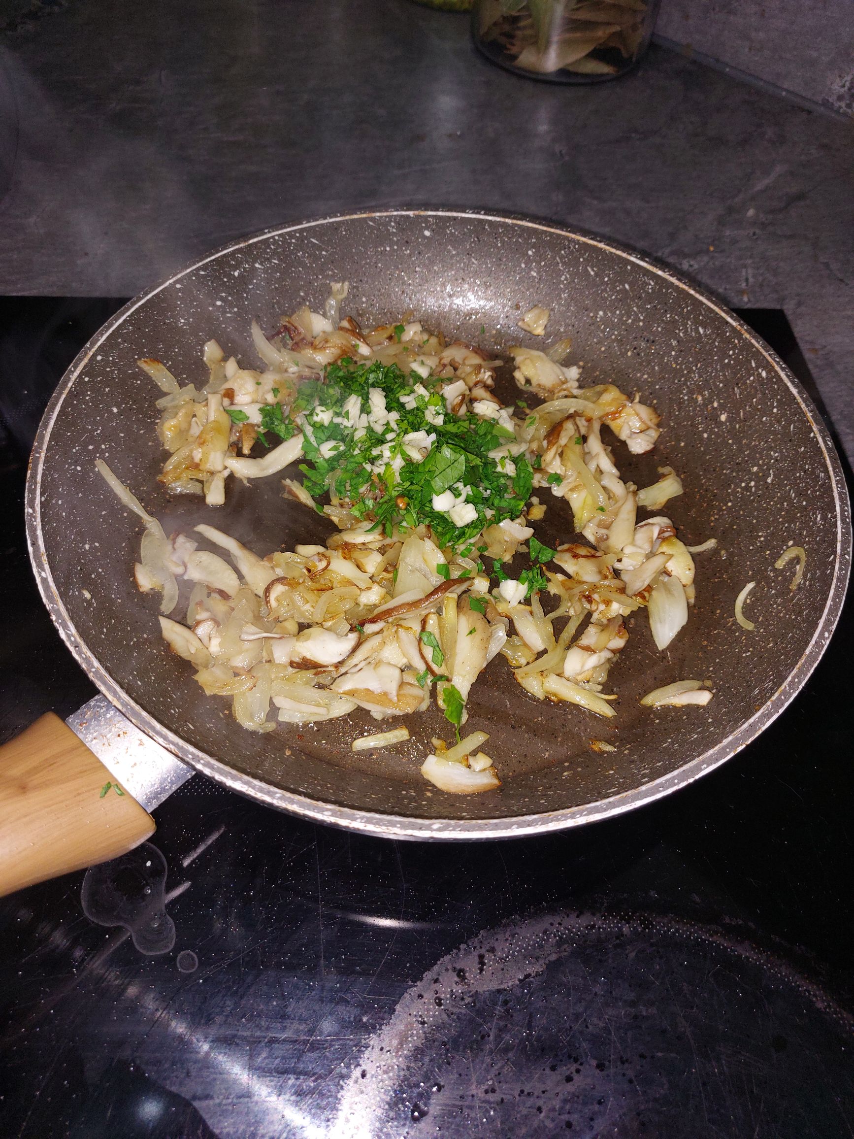 1. ko so gobe izpustile vso vodo in je ta izparela, gobe pa so začele dobivati rjavo barvo, dodamo strt česen, premešamo, da zadiši, dodamo še peteršilj in timijan, premešamo