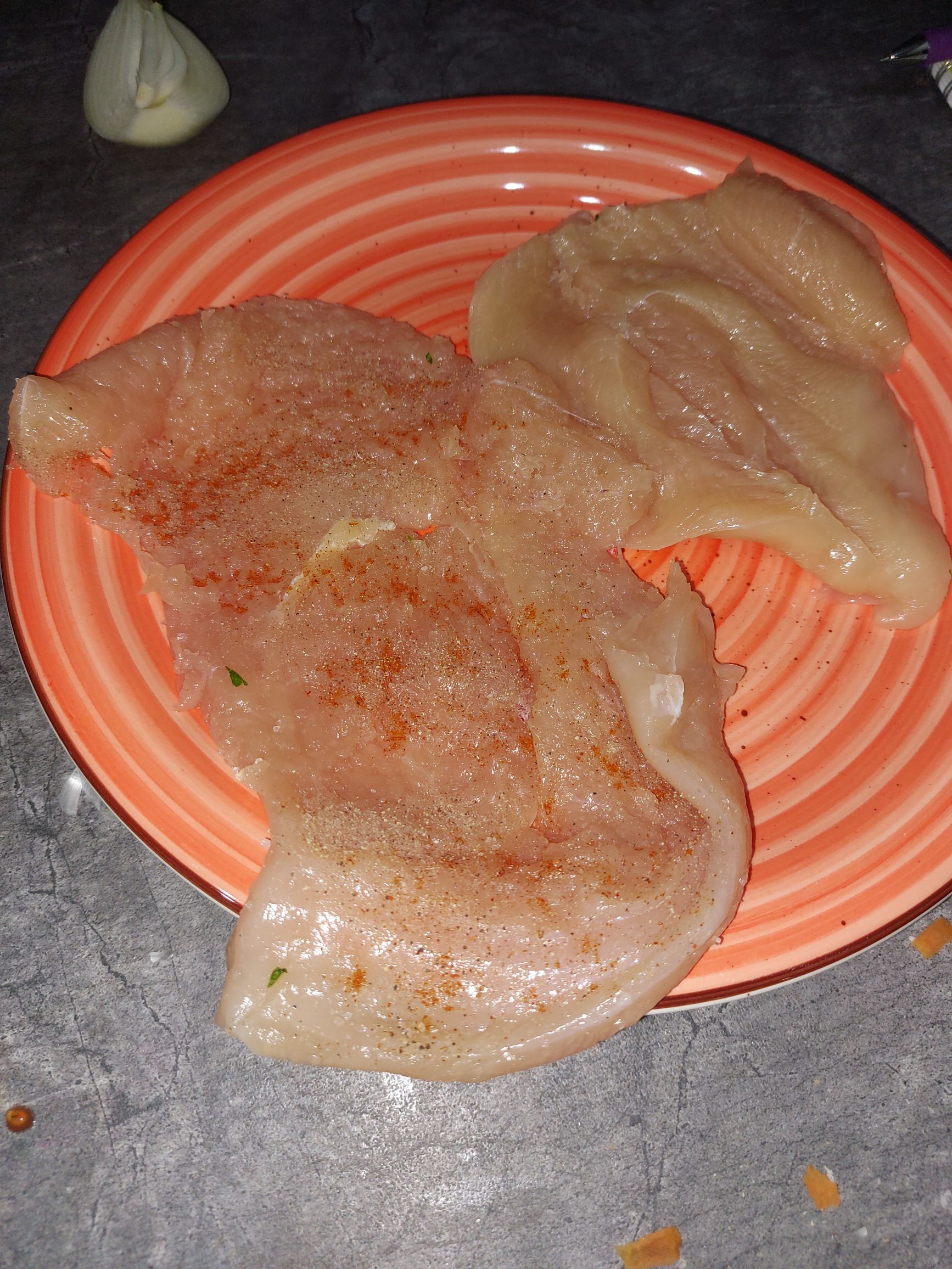 1. vmes, ko se gobe tenstajo, prsa prerežemo, jih razpremo in rahlo potolčemo, da dobimo lepe zrezke, solimo popramo in po želji čili ali kajenski