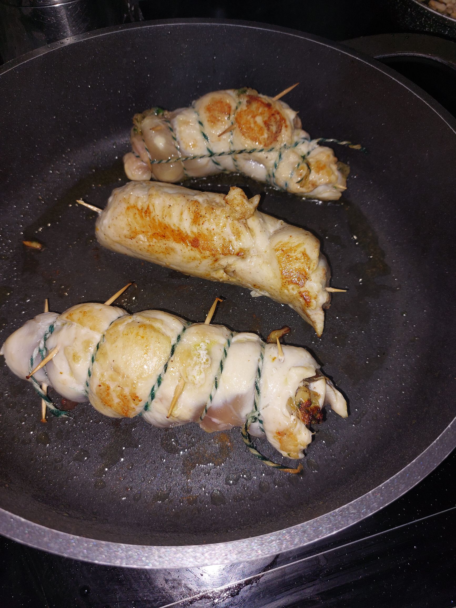1. najlažje je, če imamo ponev primerno tudi za v pečico, drugače bomo pa preložili v pekač. Raztopimo maslo in dodamo olje, roladice oz žepke na vseh straneh popečemo do zlato rjave barve 3-4 min, (vmes lahko malo zaliješ z vinom) ne pretiravaj, ker gre še v pečico, ki jo vmes že segreješ na 180°C, za 10-15 min, odvisno ali so roladice ali žepki. Po potrebi vmes prilijemo malo vode ali jušne osnove ali vina