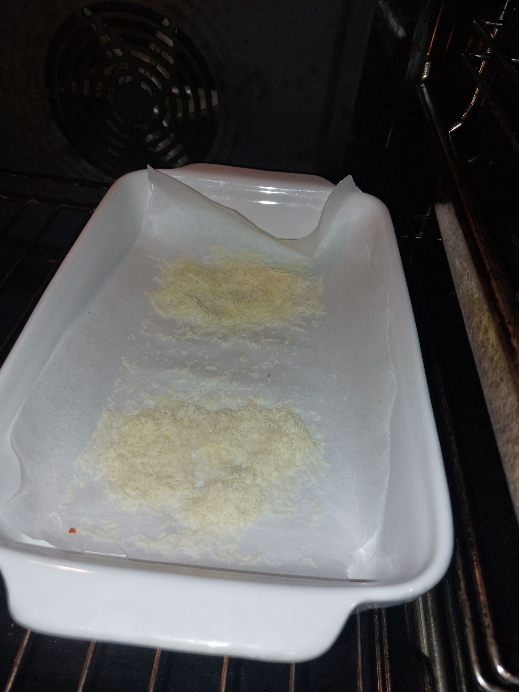 1. če želimo malo bolj fensi zadevo, na peki papir naribamo parmezan v kosu (ne iz že naribanega) in ga malo potlačimo v poljubno obliko, damo v že prej ogreto pečico 180°C za cca 10 min, da se sir stopi in postane zlato rjav