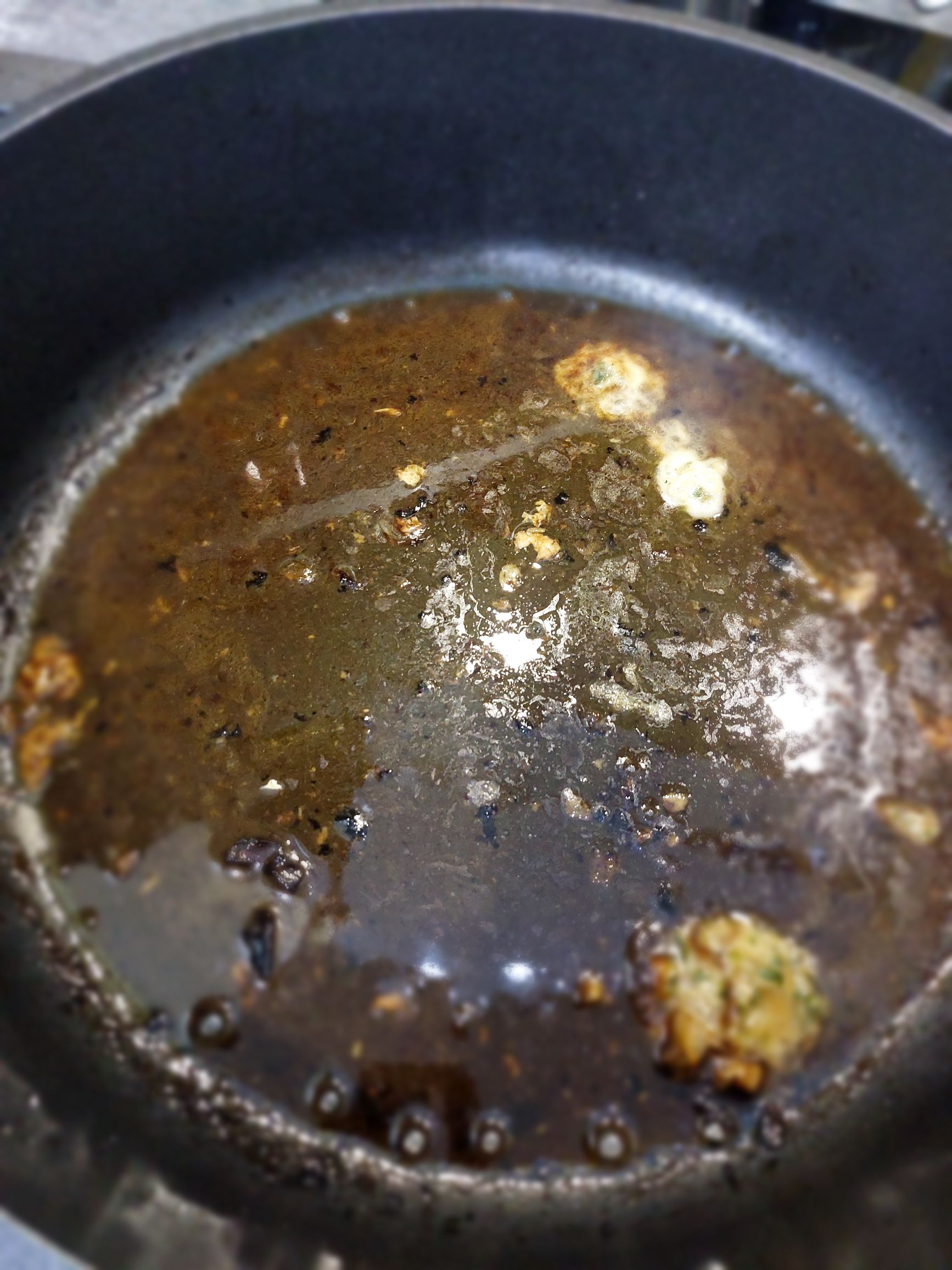 1. ponev pa prestavimo na ploščo, zalijemo z vinom, postrgamoi vse zapečene koščke, prilijimo še jušno osnovo ali vodo, povremo do polovice vmešamo še parmezan in hladno maslo, preverimo okuse, po potrebi solimo, popramo