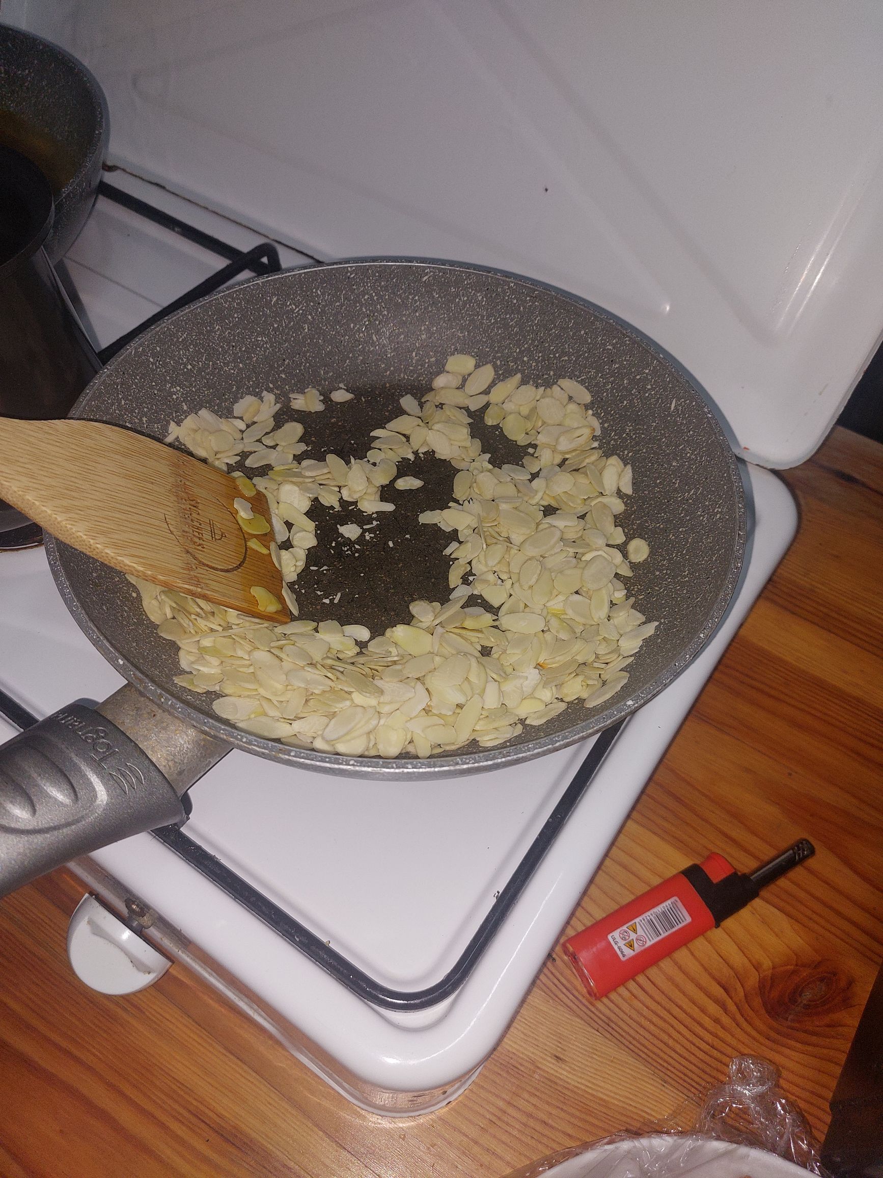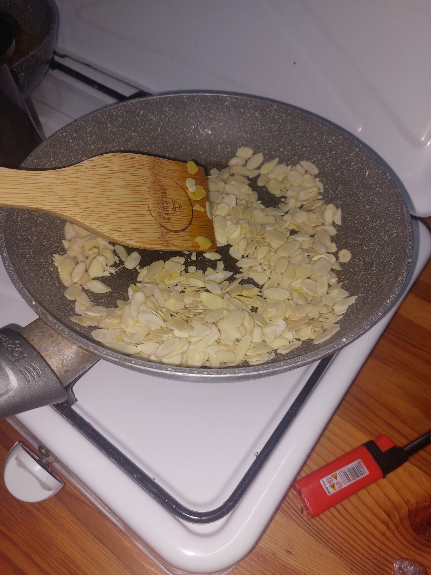 v hladno ponev, brez olj, vržemo mandljeve lističe in jih na majhnem ognju počasi pražimo, stalno mešamo, pazimo da ne zažgemo