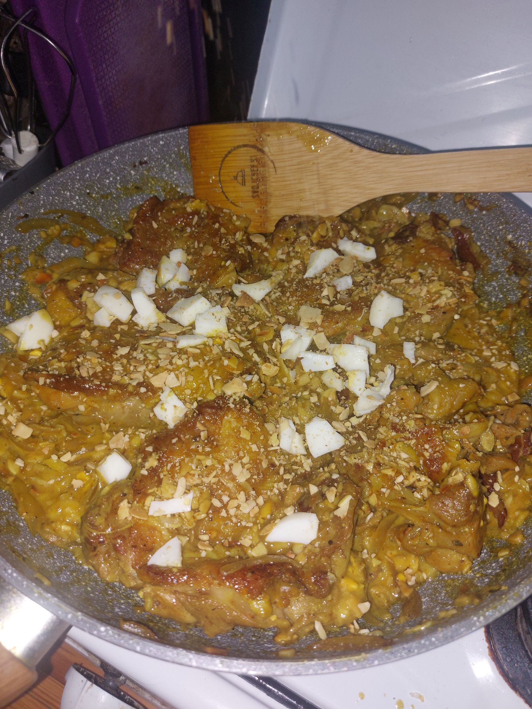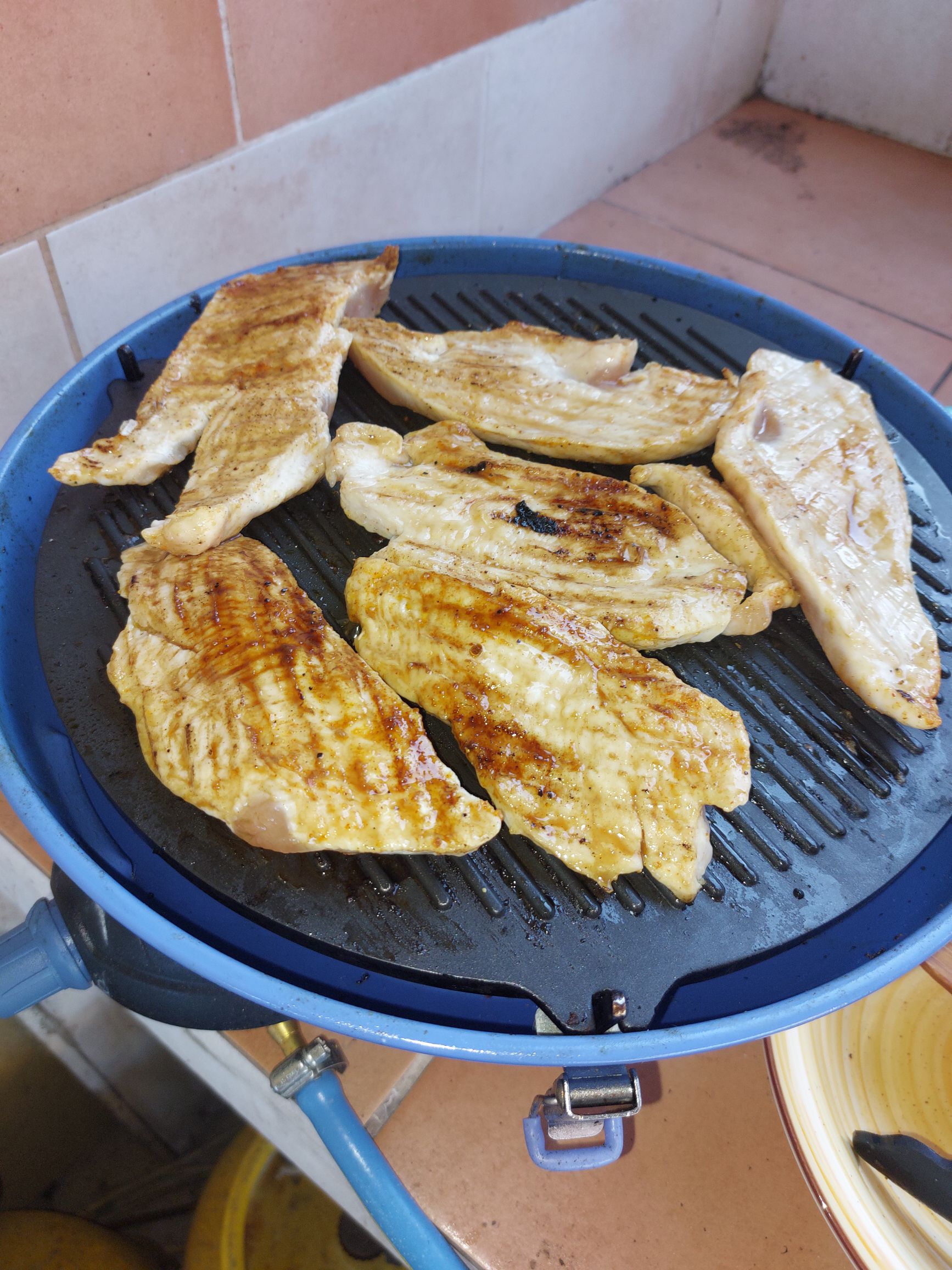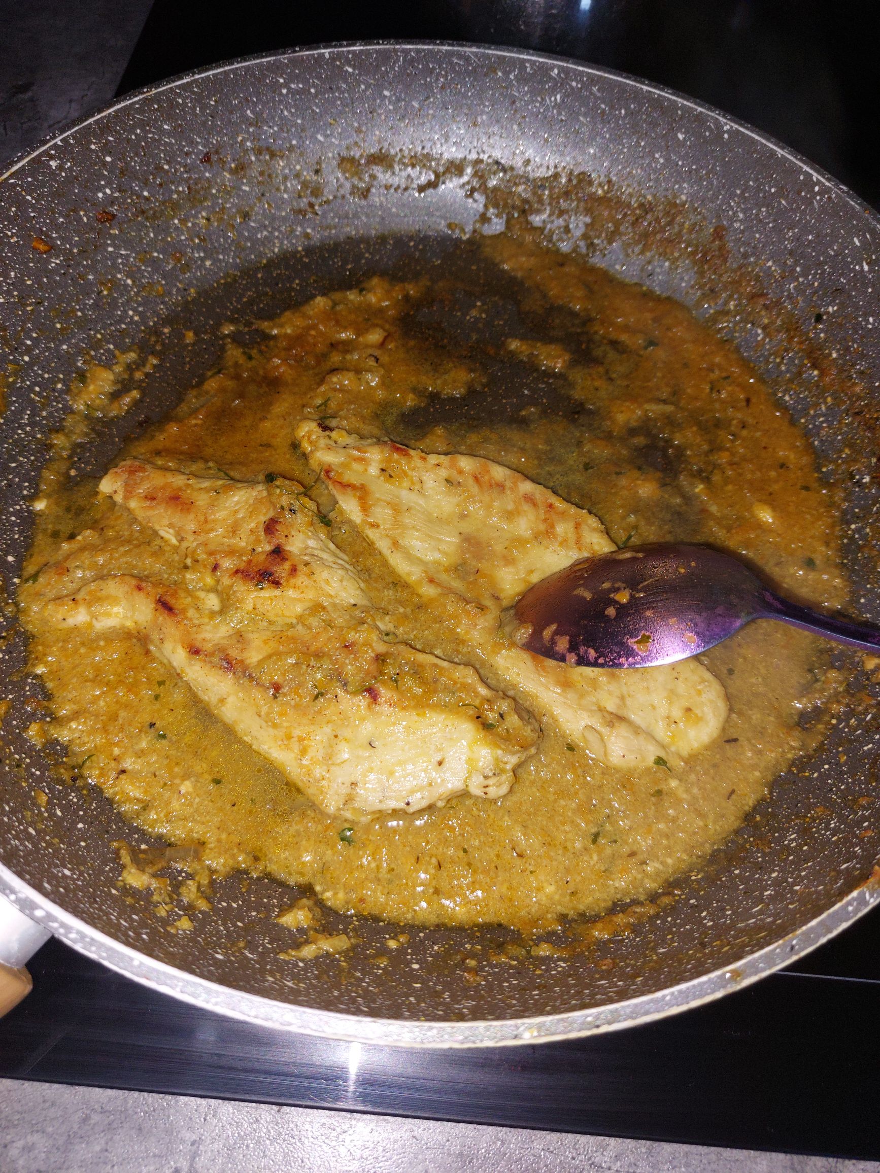 vmes ko pražimo čebulo, piščanca hitro popečemo, ni potrebno do konca, ker se bo še kuhal, lahko pa porabimo včerajšnje ostanke z žara