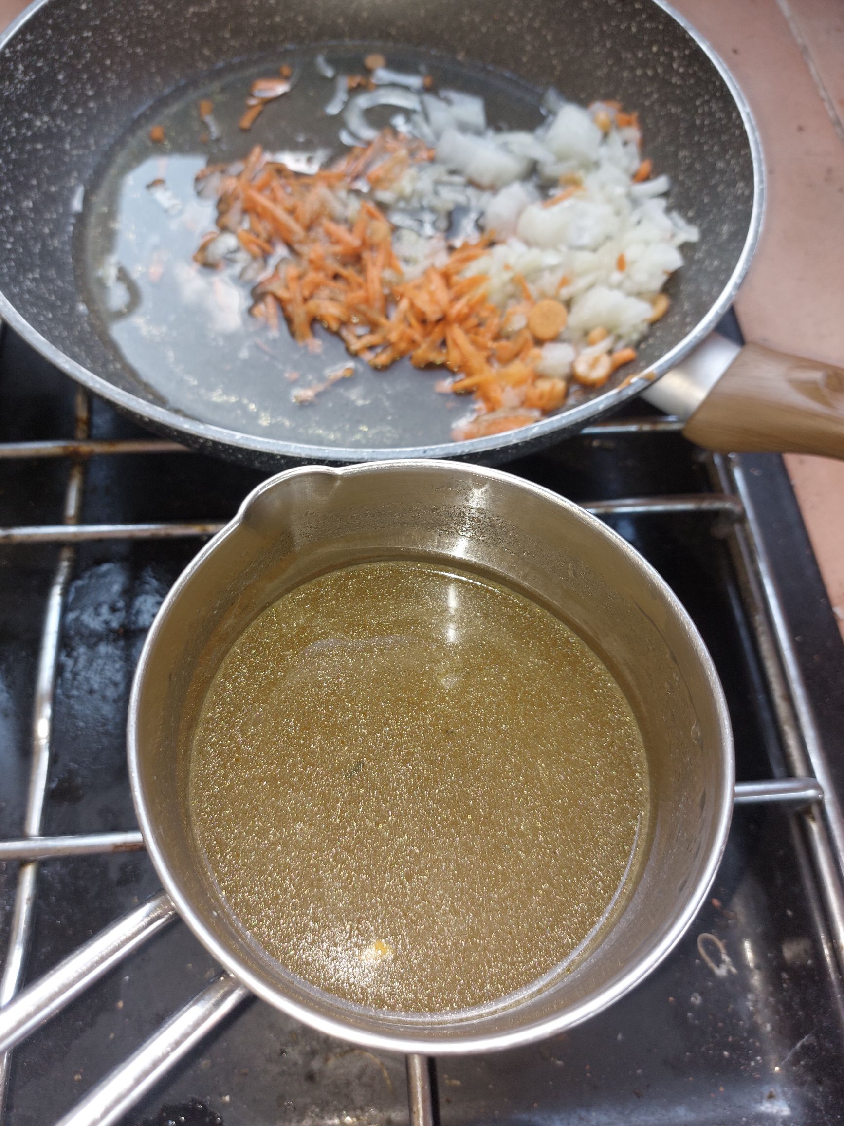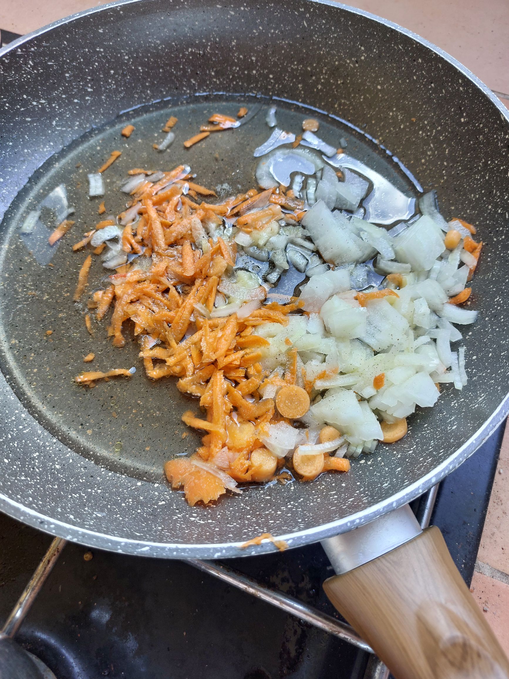 čebulo drobno narežemo in na olju počasi pražimo, dodamo naribano korenje in drobno narezano zeleno