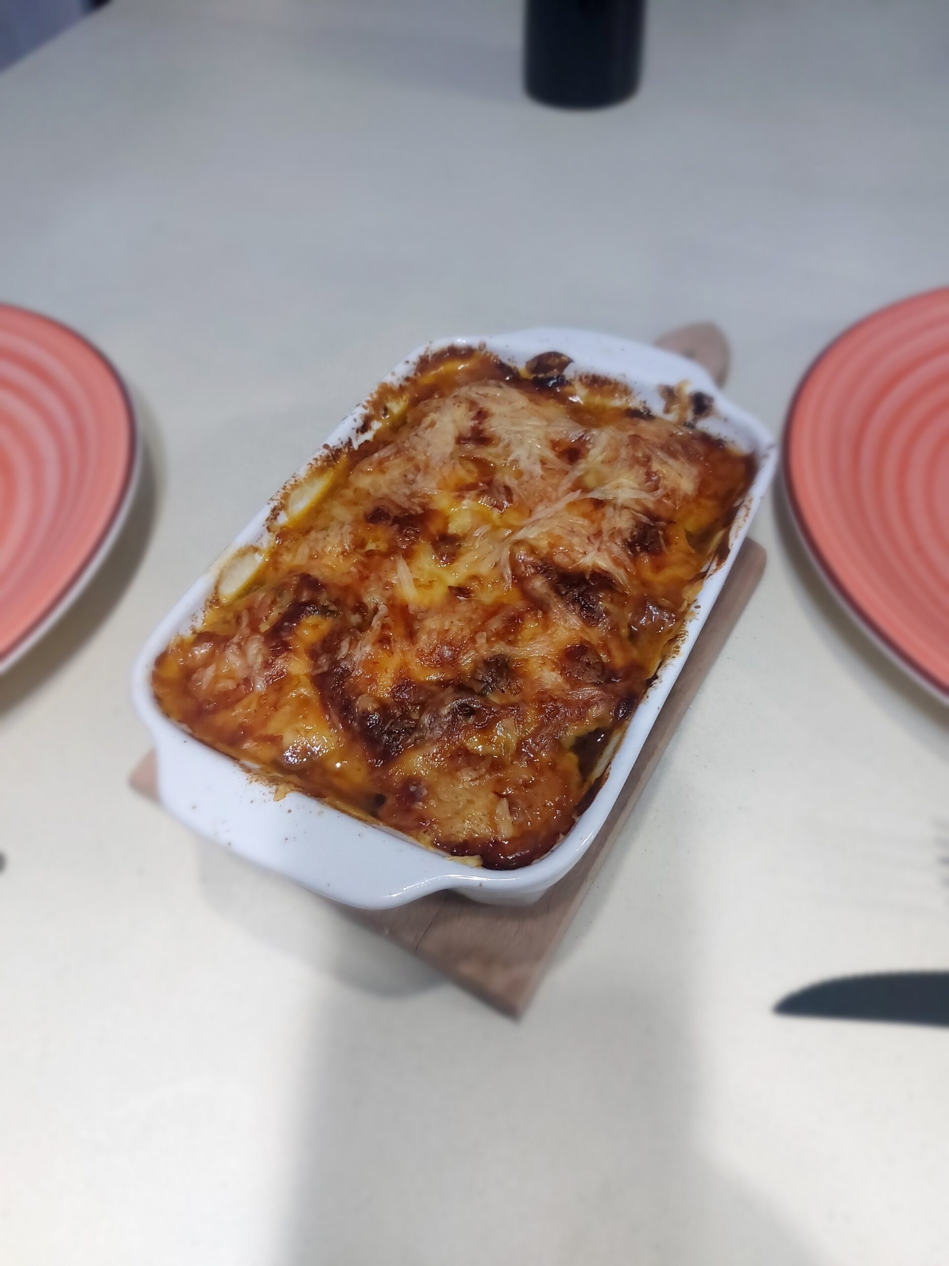 Poiščemo primeren steklen ali keramični pekač, na dno nalijemo malo bešamela, nanj položimo prvo plast testenin. Glede na velikost oz globino pekača se odločimo ali bomo imeli 3 ali 4 plasti testenin, temu primerno razdelimo tudi mesni nadev in bešamel.