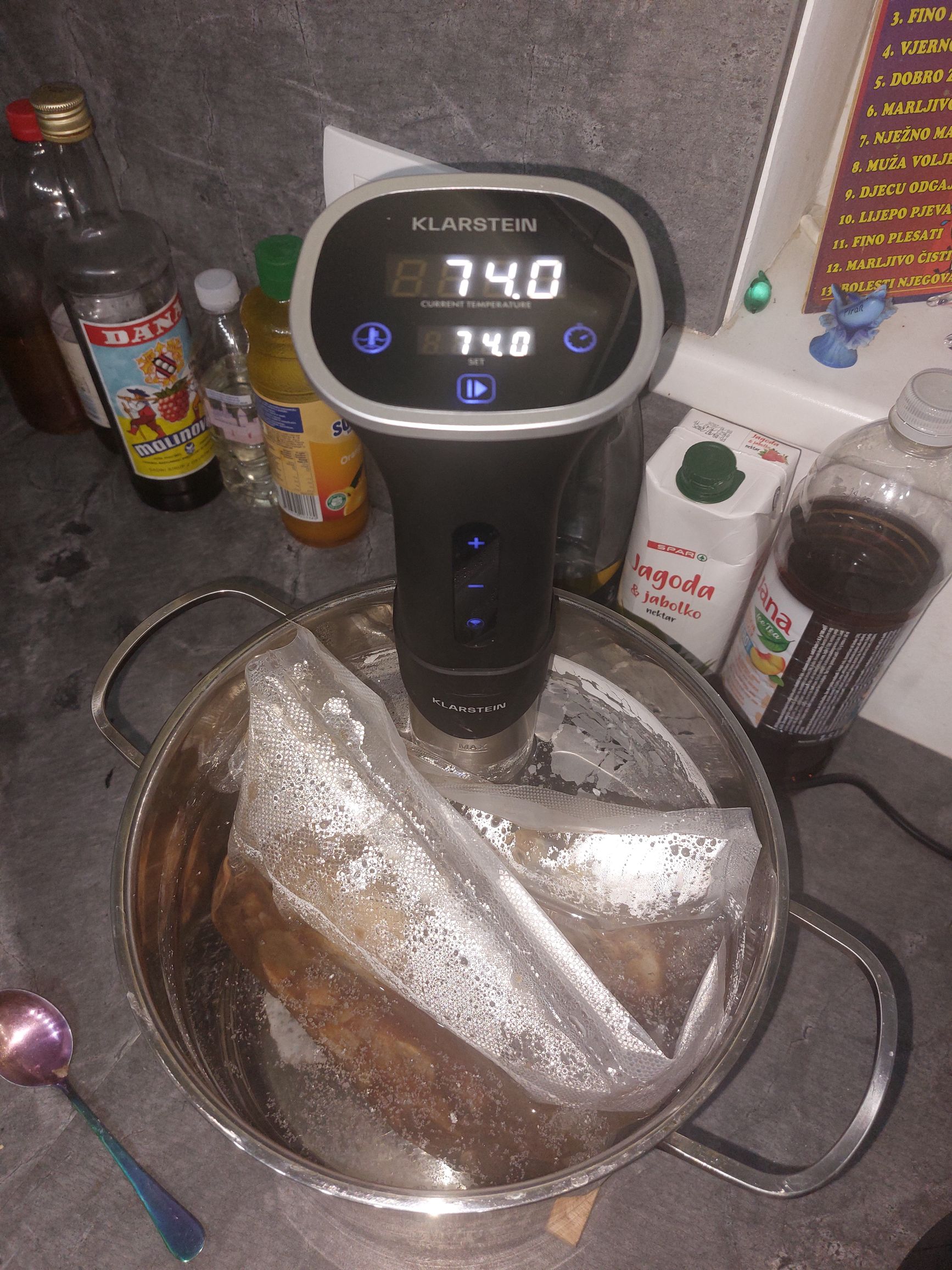 74 °C / 8 ur  zelo sočna, lepa struktura, bedra ostanejo vizualno cela (top za prezentacijo)