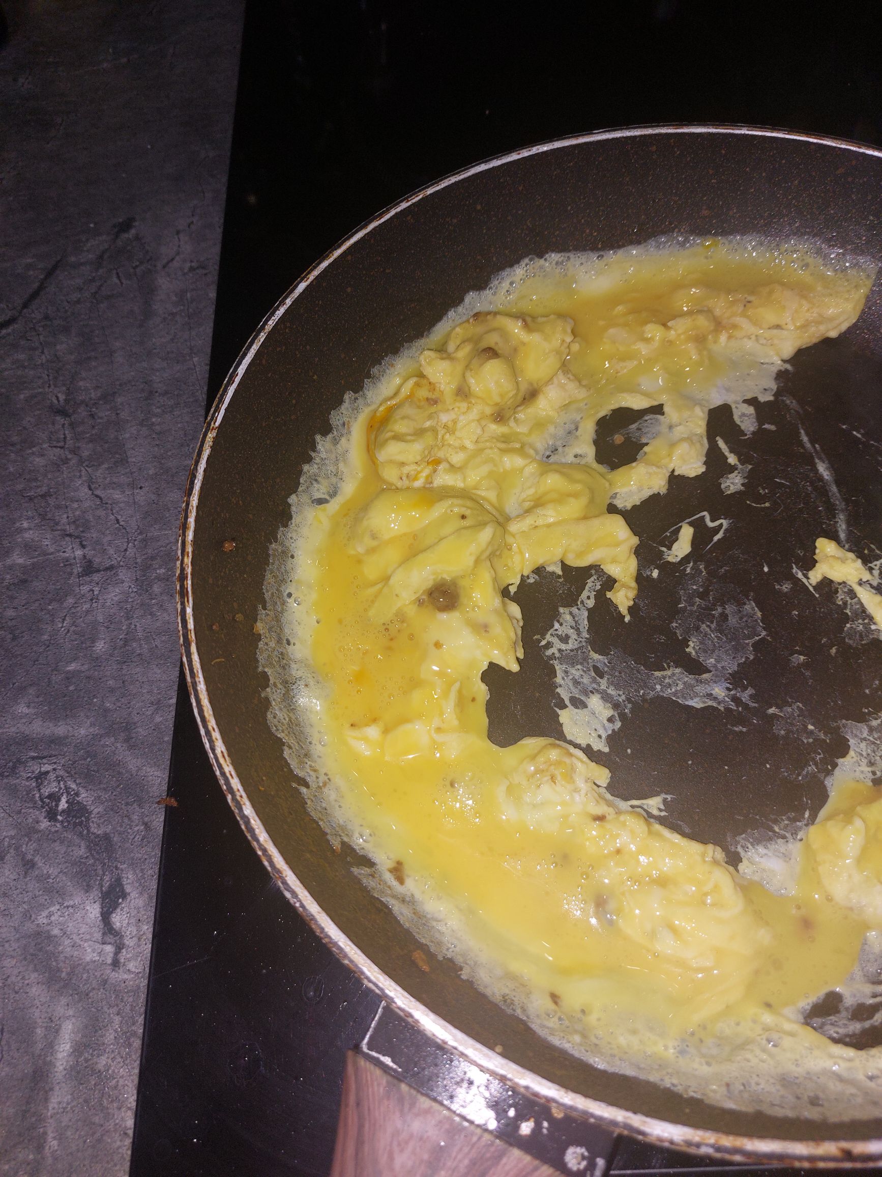 1. V isti ponvi dodaj malo olja, vlij razžvrkljani jajci, hitro premešaj in ko so komaj pečena, jih odstrani.