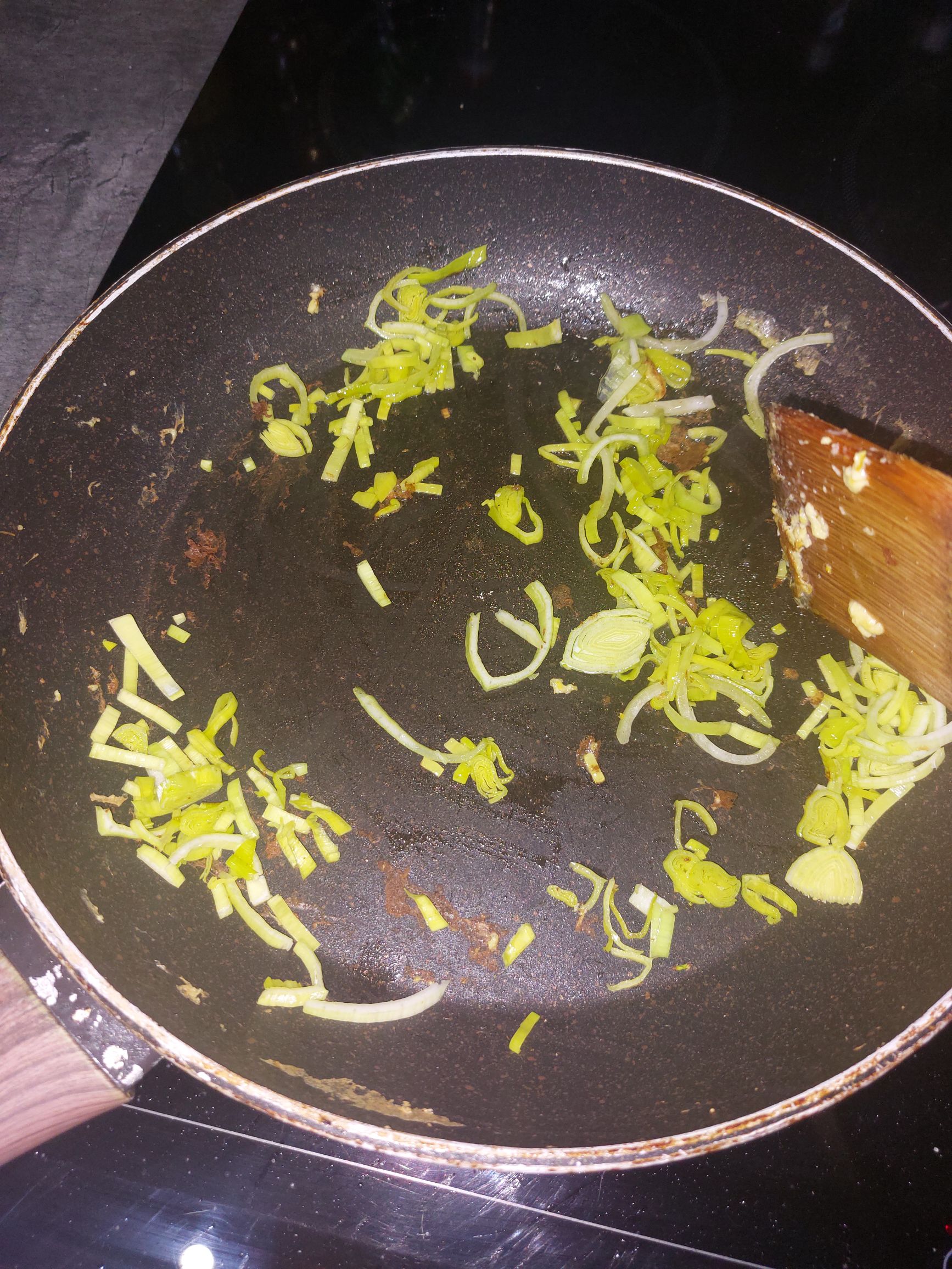 1. Dodaj olje, por in praži 2–3 minute, da se zmehča in rahlo karamelizira. Dodaj česen in praži še 30 sekund.