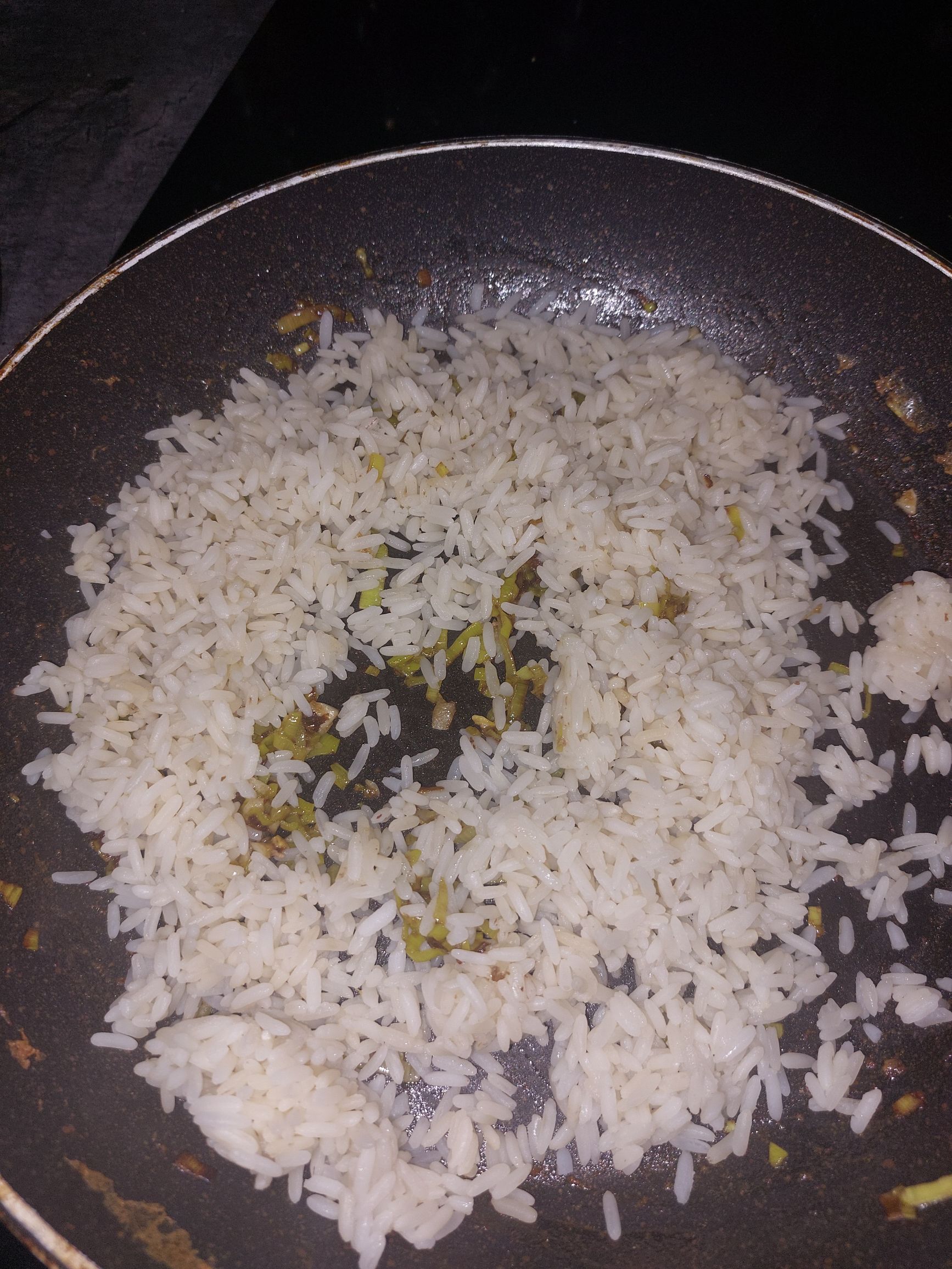 1. Dodaj riž, razbij grudice in praži na močnem ognju 3–4 minute, da se rahlo zapeče.