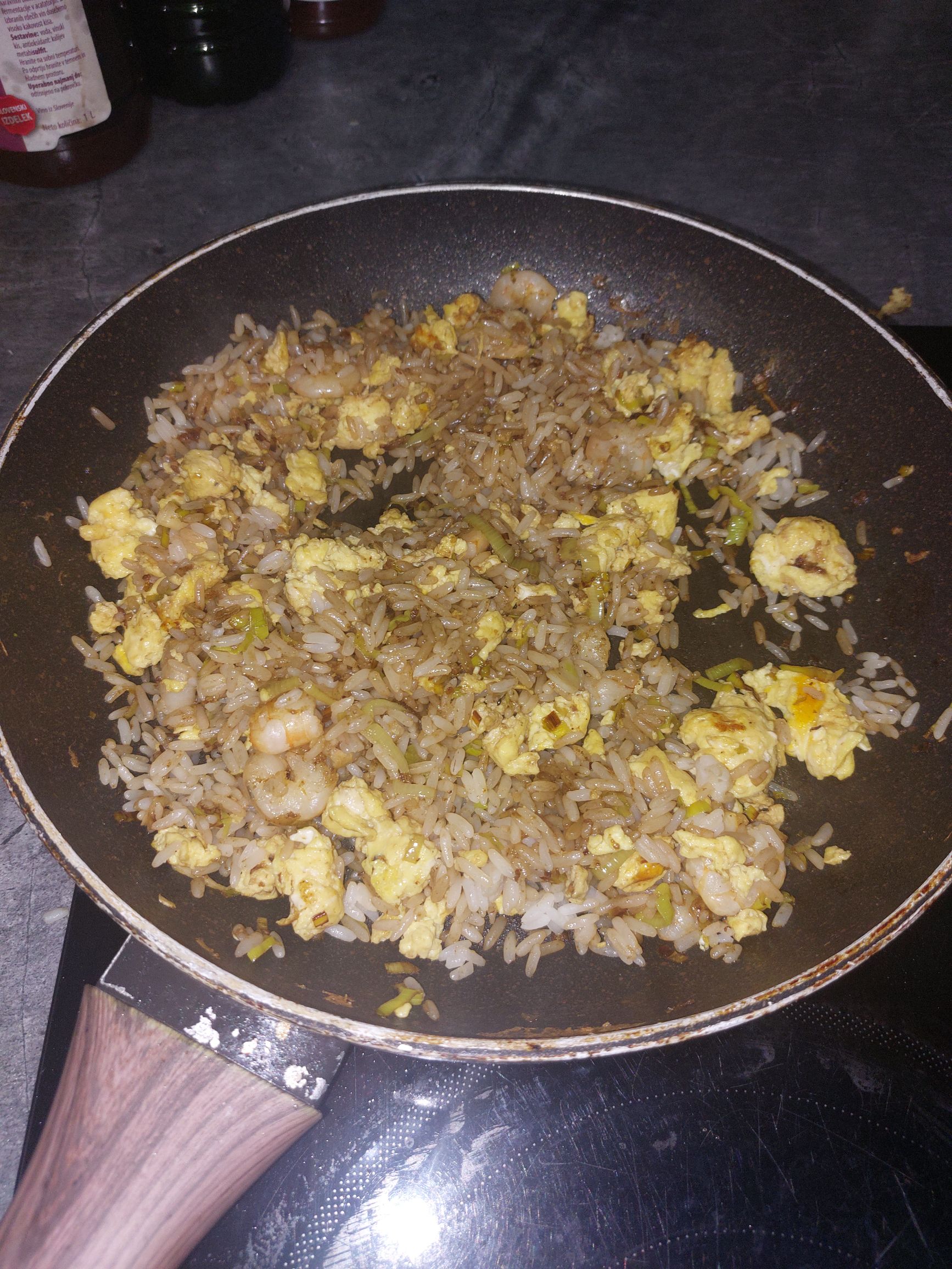 1. V ponev vrni kozice in jajca, dodaj sojino omako, sezamovo olje in poper, za umami lahko še 0,5 čž ostrigine omake.  Hitro premešaj, poskusi in po potrebi dosoli, za piko na i dodaj kapljico limoninega soka.