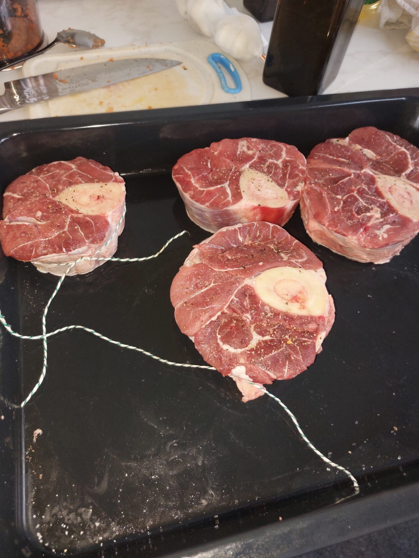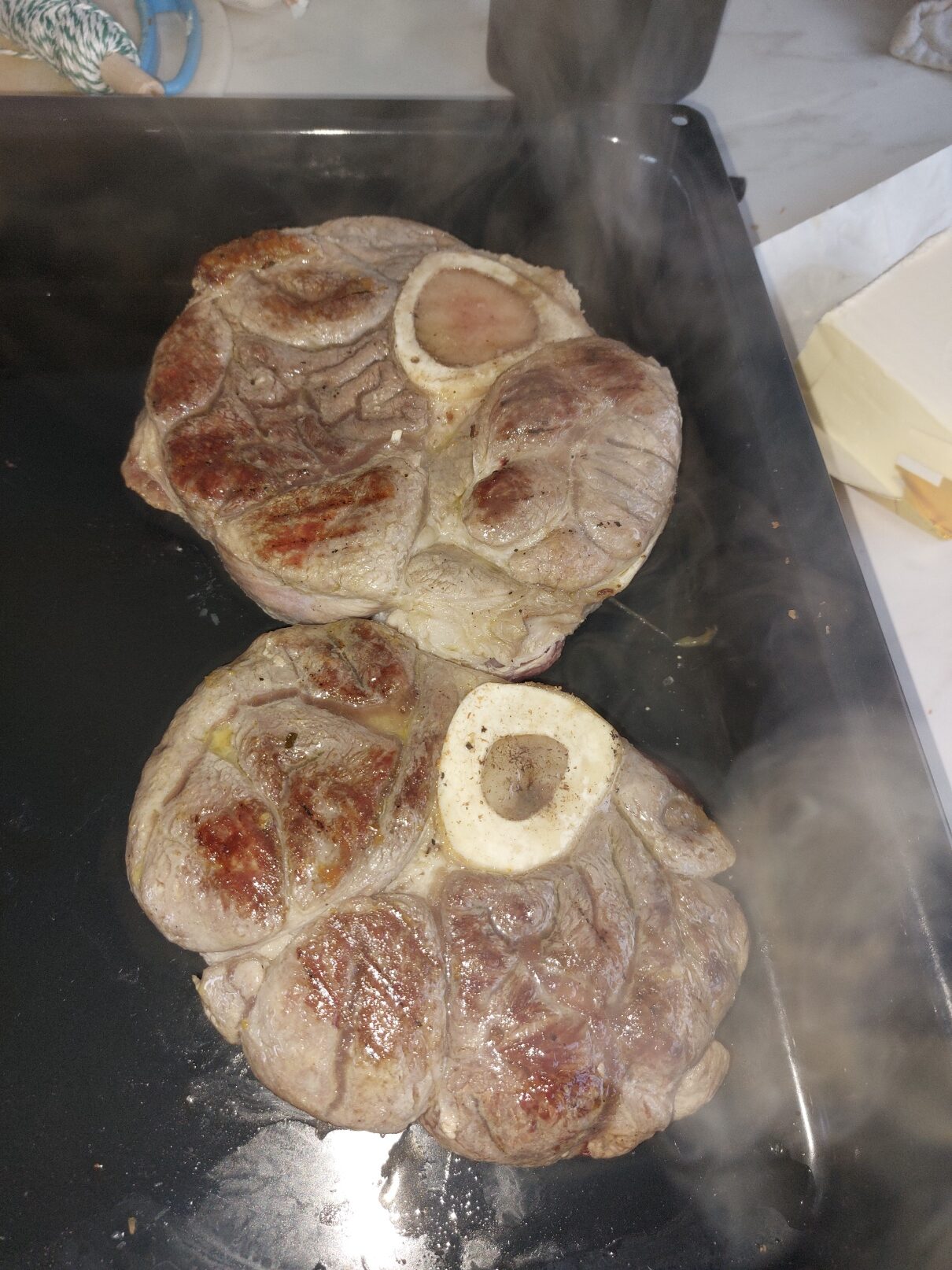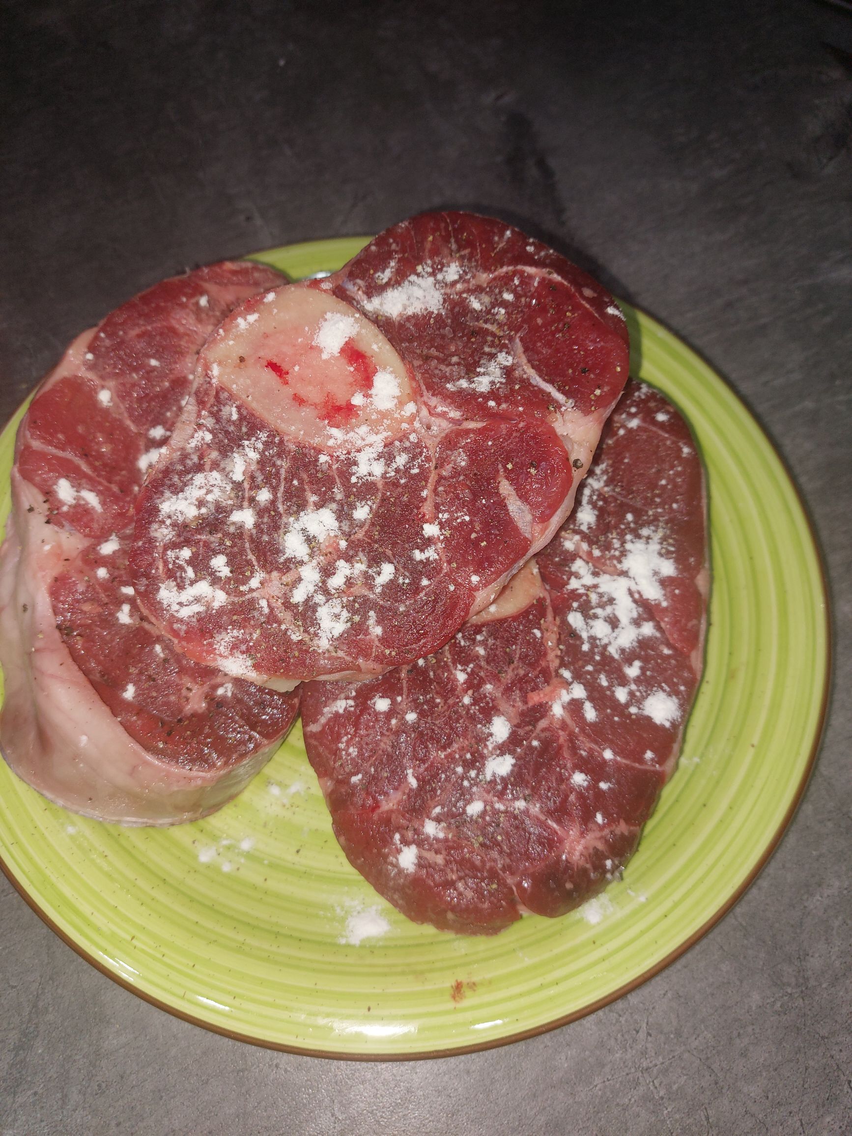 na segret krožnik razmažeš kremno polento, cca 1 cm debelo (ne na sredino), gor postaviš meso (ja meni je razpadel🥹), kostni mozek delno premažeš po mesu, na drug konec pa postaviš žličko gremolate. Omaka mora bit reducirana ne juhasta, cca 2 žlici jo damo okoli polente, malček pa še na meso, nastrgaš lahko še kanček limonine lupinice ali dodaš nekaj kapljic balzamičnega kisa
