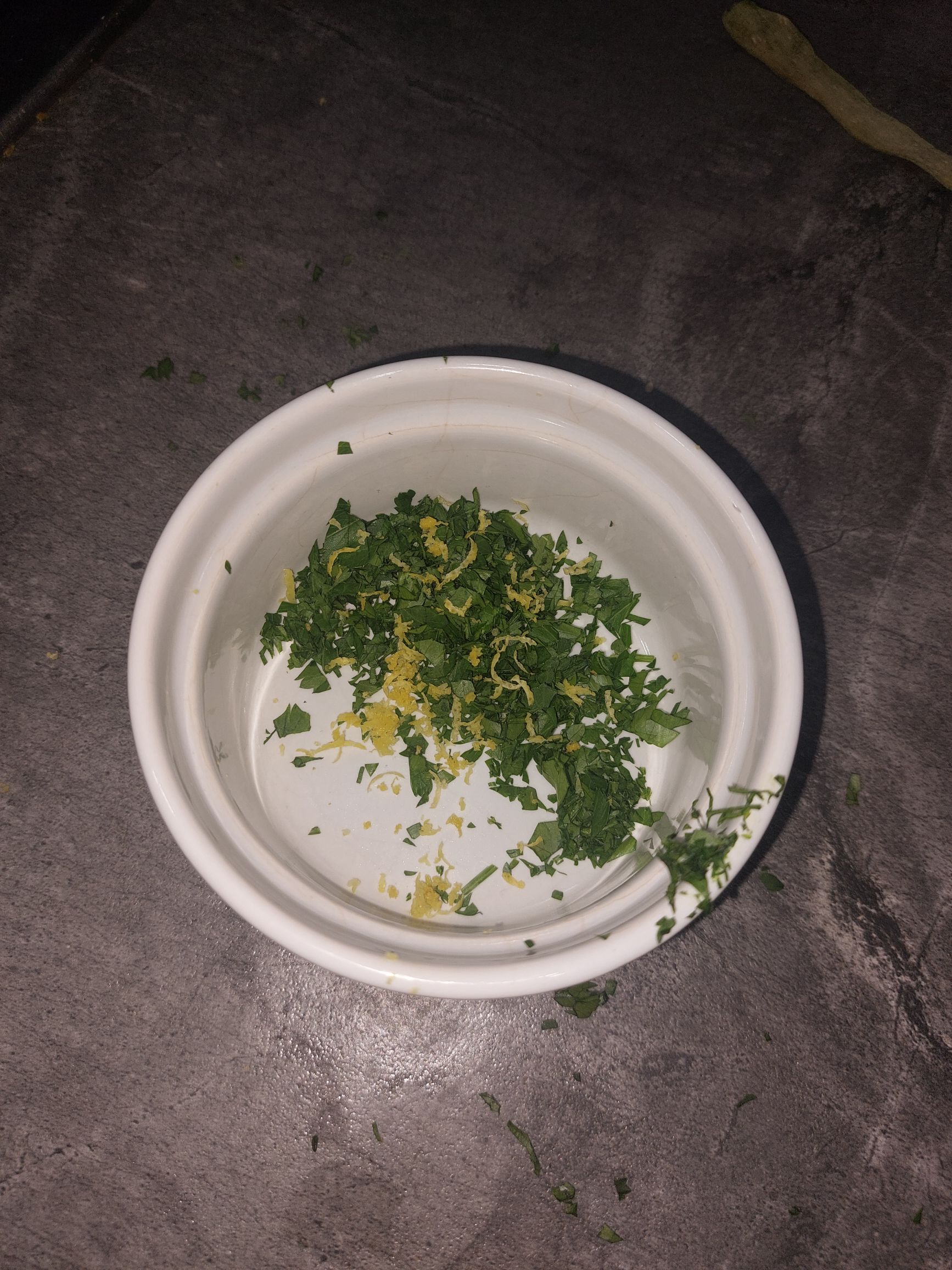 vmes pripravimo še gremulatu, nasekljamo peteršilj in česen, nastrgamo limonino lupinico, ter dodamo malo olivnega olja