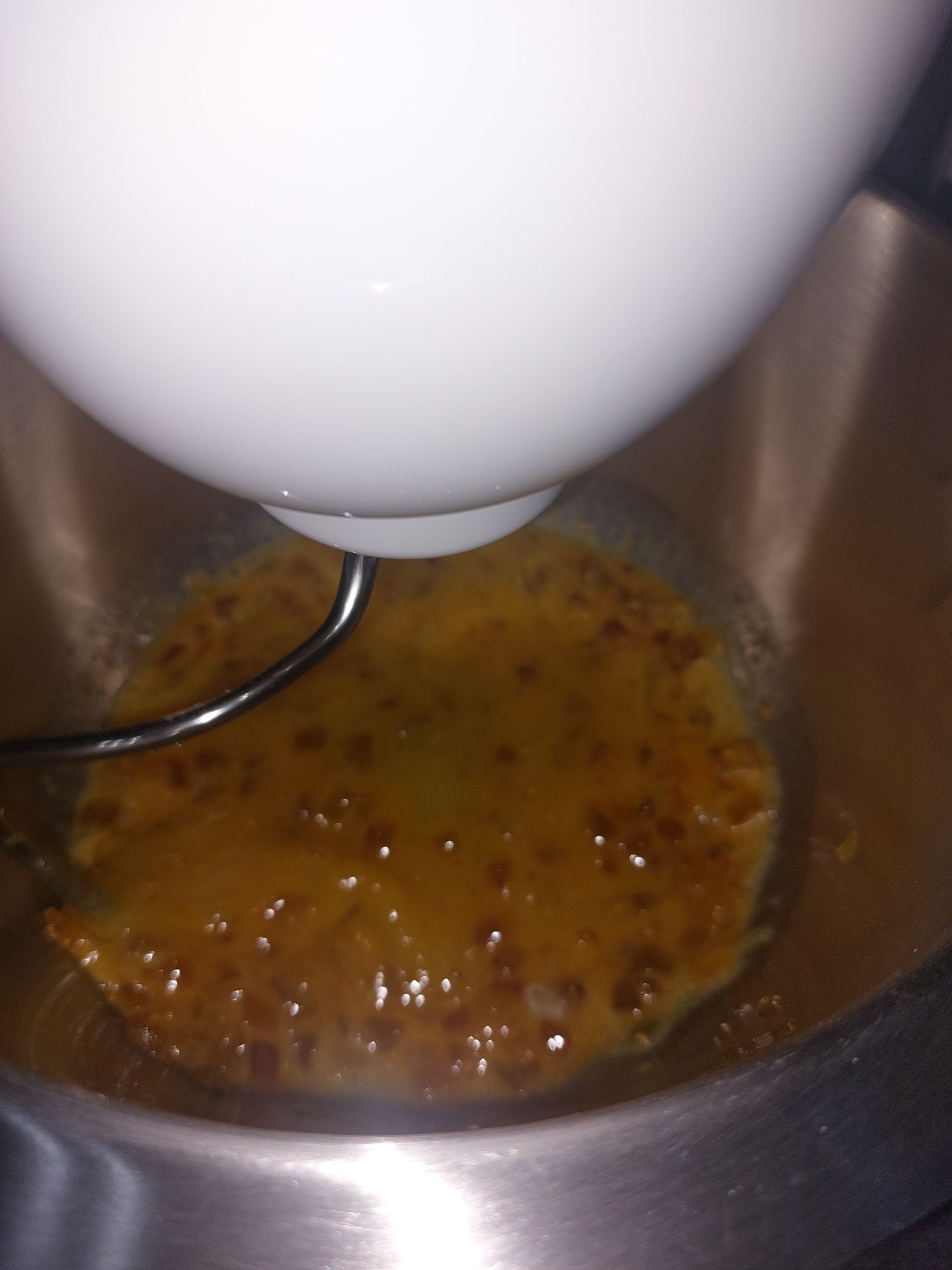Jajca, pomarančni sok, lupinico, cimet, vanilijev sladkor in sladkor penasto zmešamo.