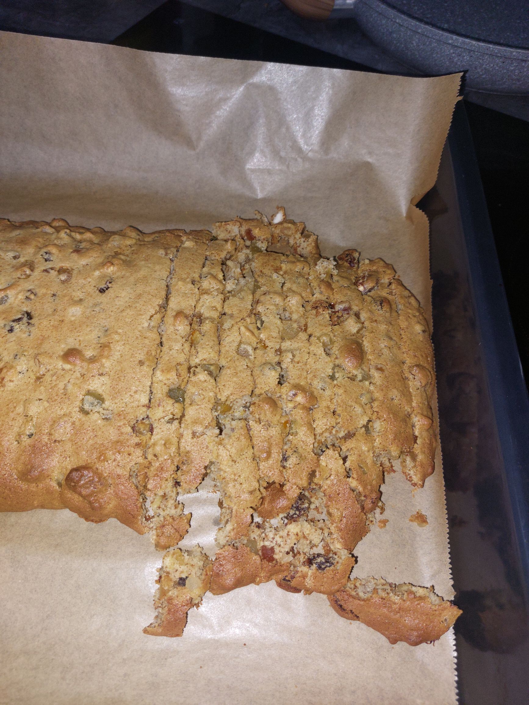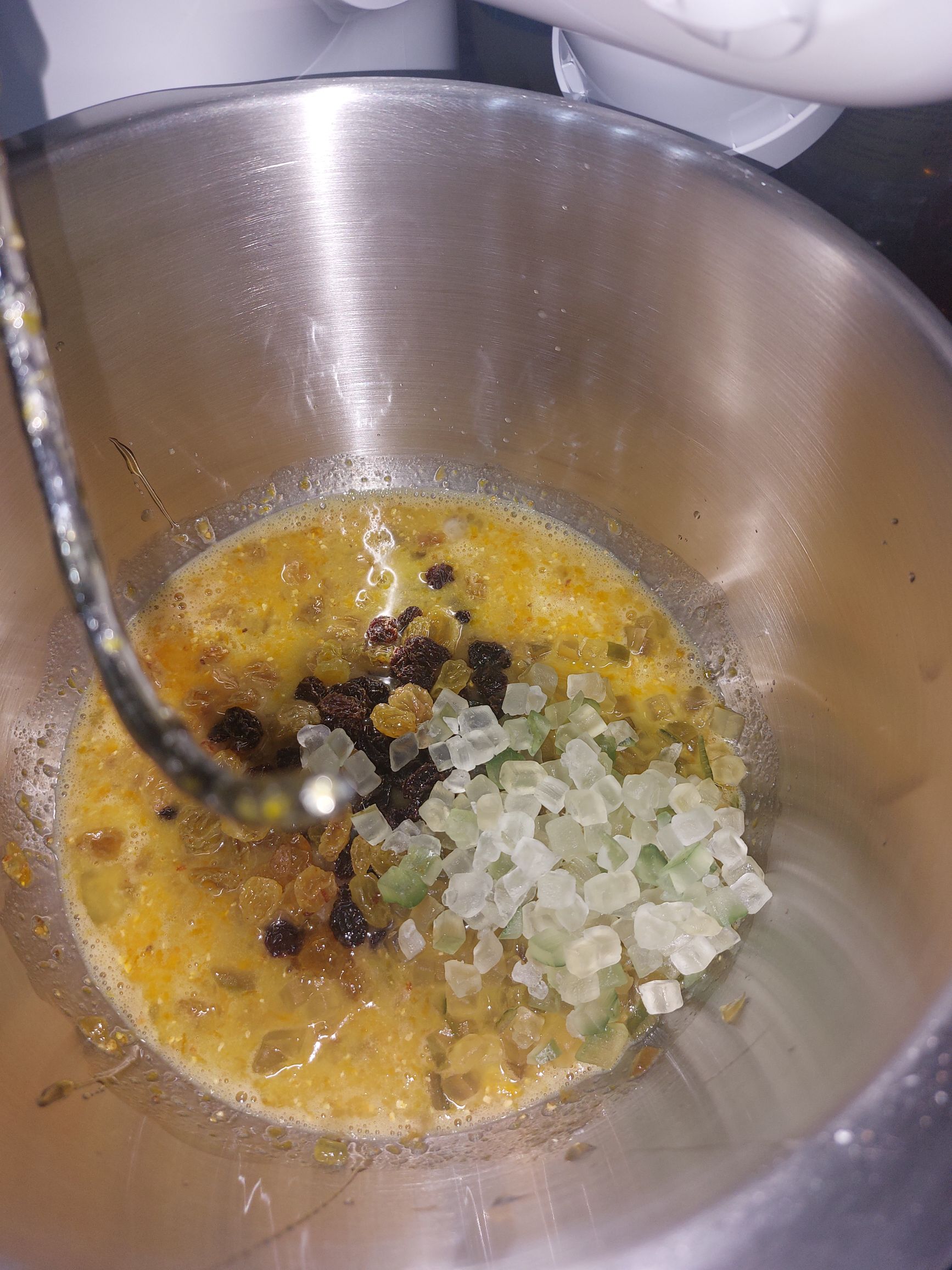 dodamo lešnike, rozine namočene v vodi ali rumu, kandirano sadje oz sestavine po našem izboru (vsota tvojih sestavin naj bo enaka vsoti orehov+rozine+kandirano sadje v tem receptu), zmešamo, dodamo še moko in pecilni prašek, dobro zmešamo