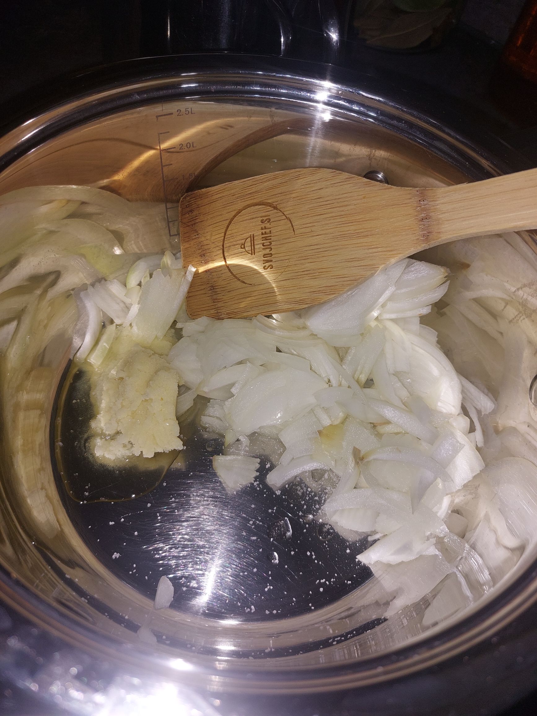 čebulo narežemo in jo na masti ali olju pražimo, solimo, zalijemo z vinom