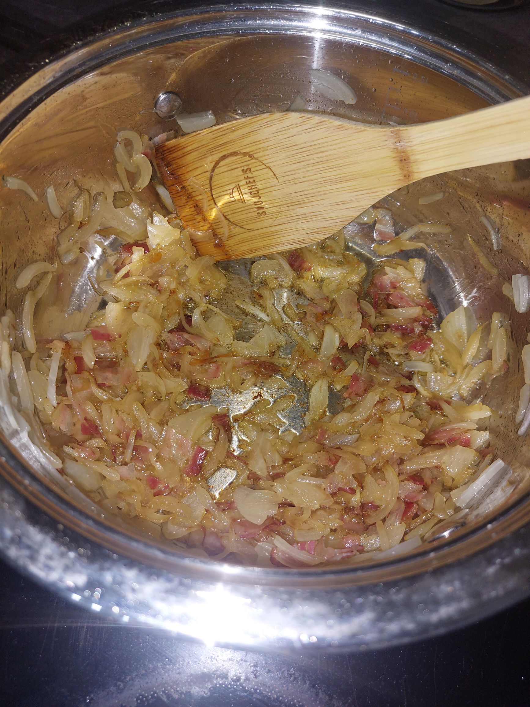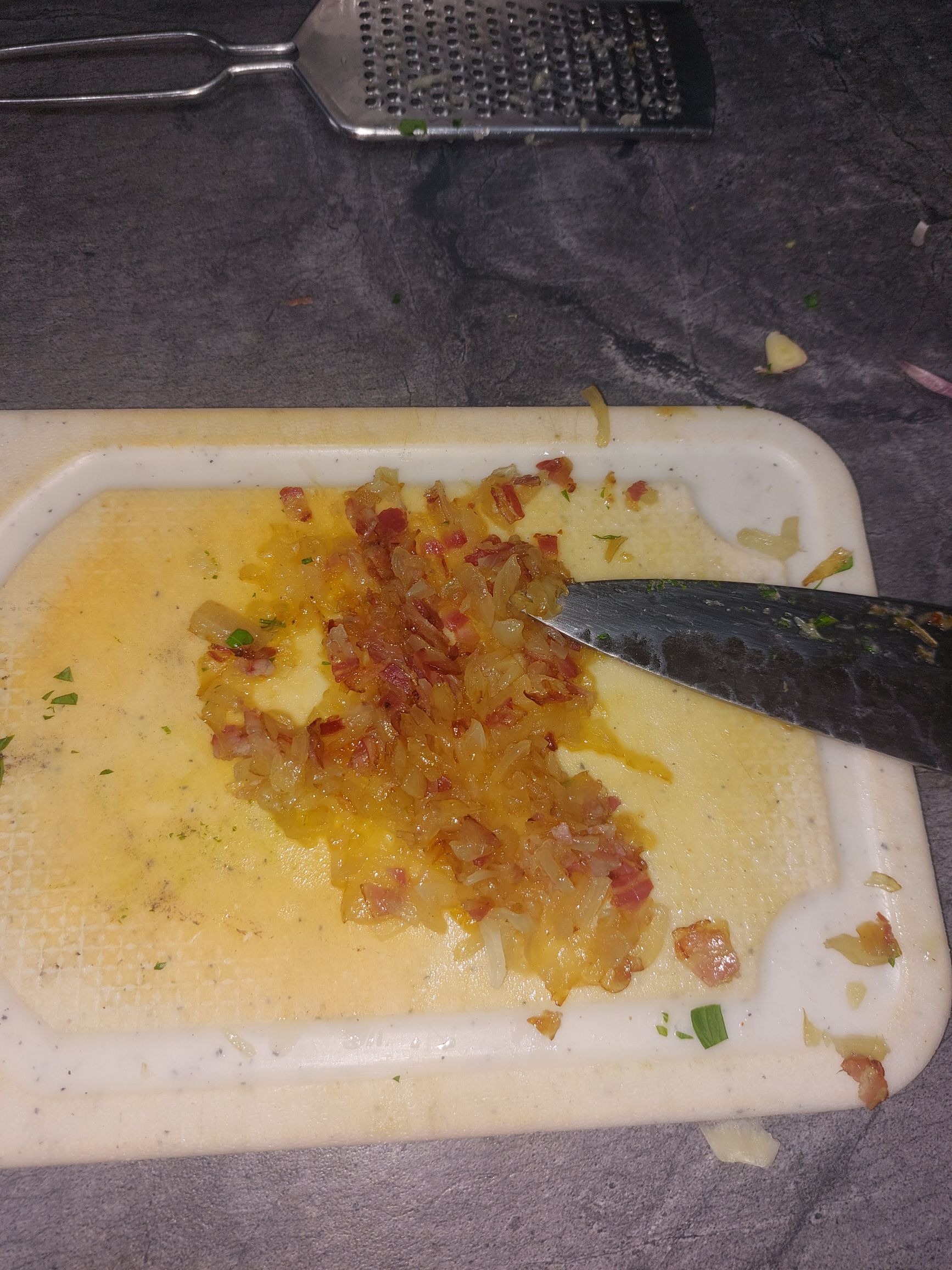 čebuli v posodo dodamo panceto in naprej pražimo, ko je panceta popražena hitro nastrgamo še česen, zadišimo, polovico čebule vzamemo ven, v posodi pa nadaljujemo s pripravo omake