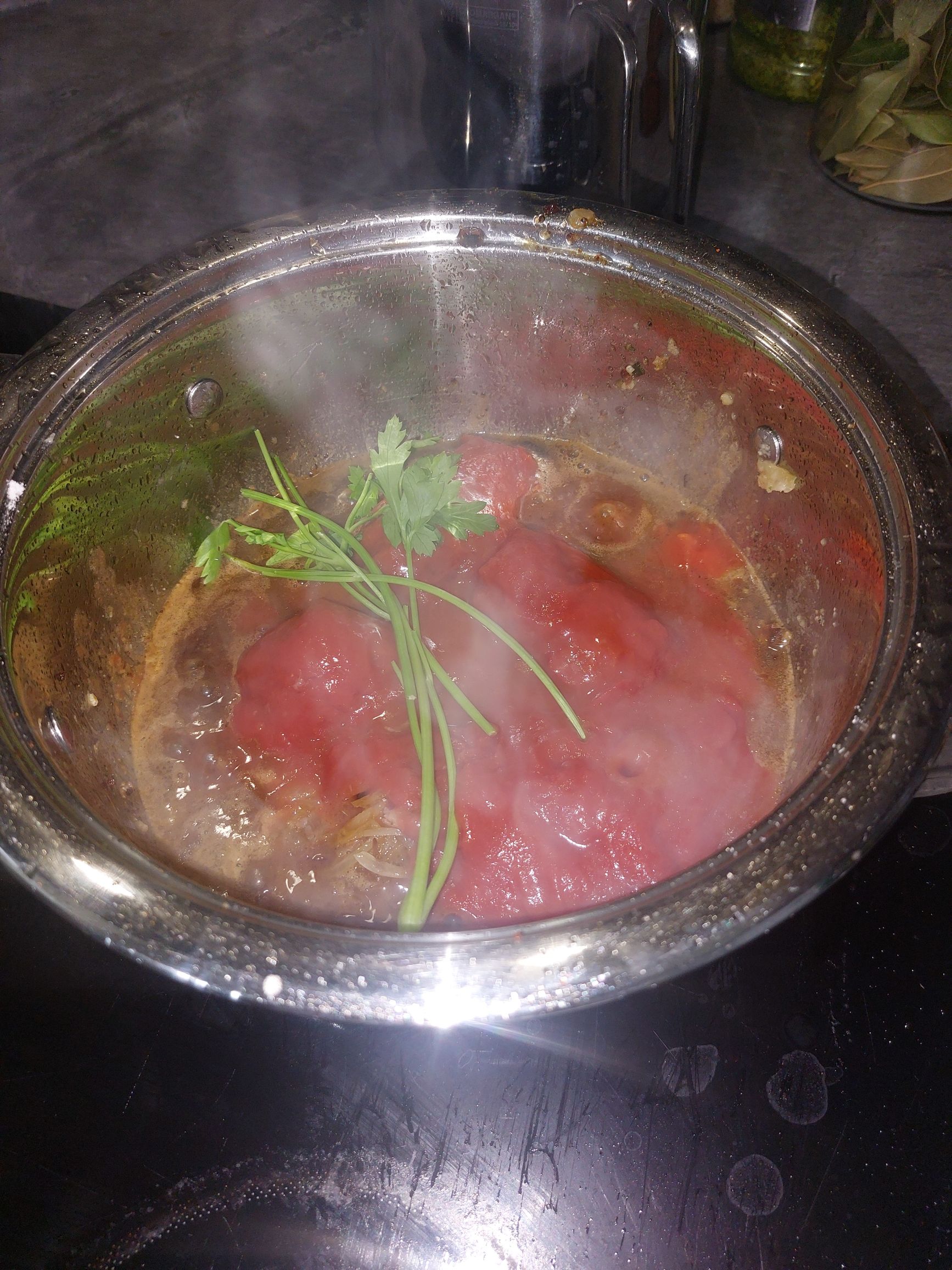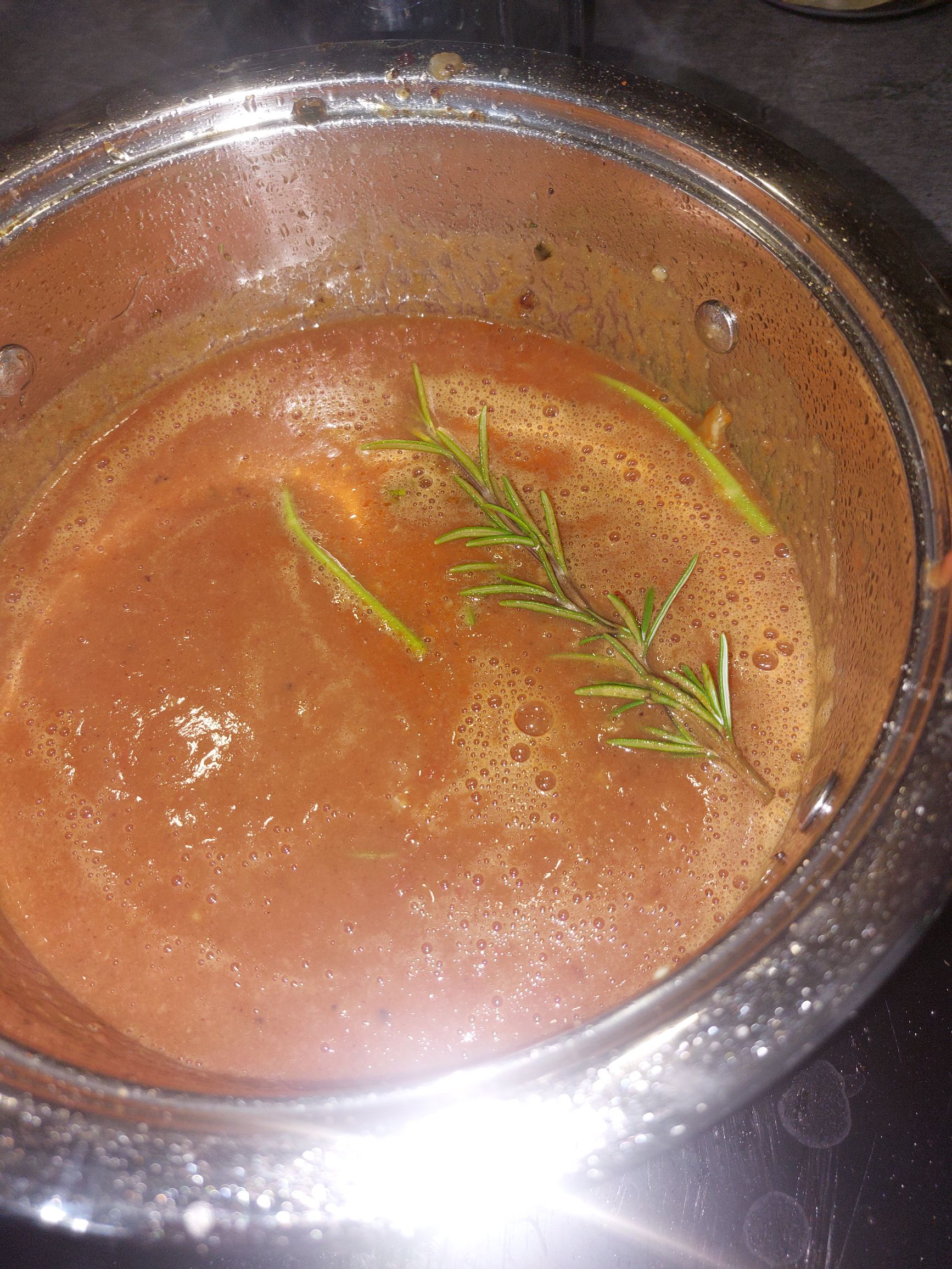 jušno osnovo, začimbe in če imamo morda košček skorje parmezana, na nežnem ognju kuhljamo, da se okusi povežejo, po potrebi solimo in popramo