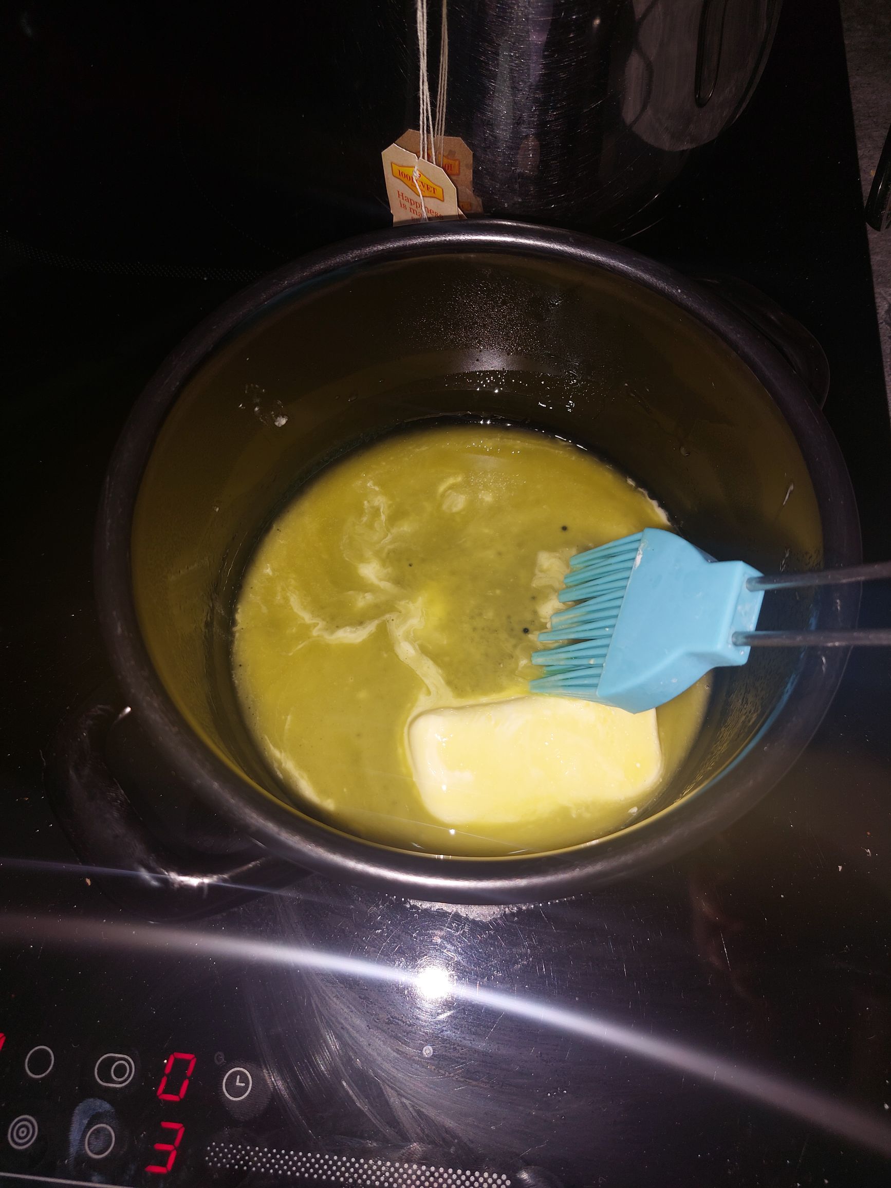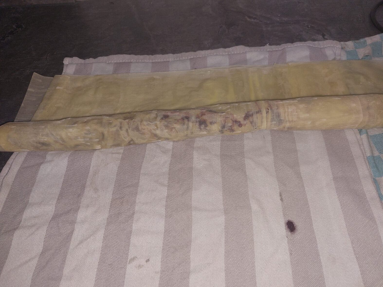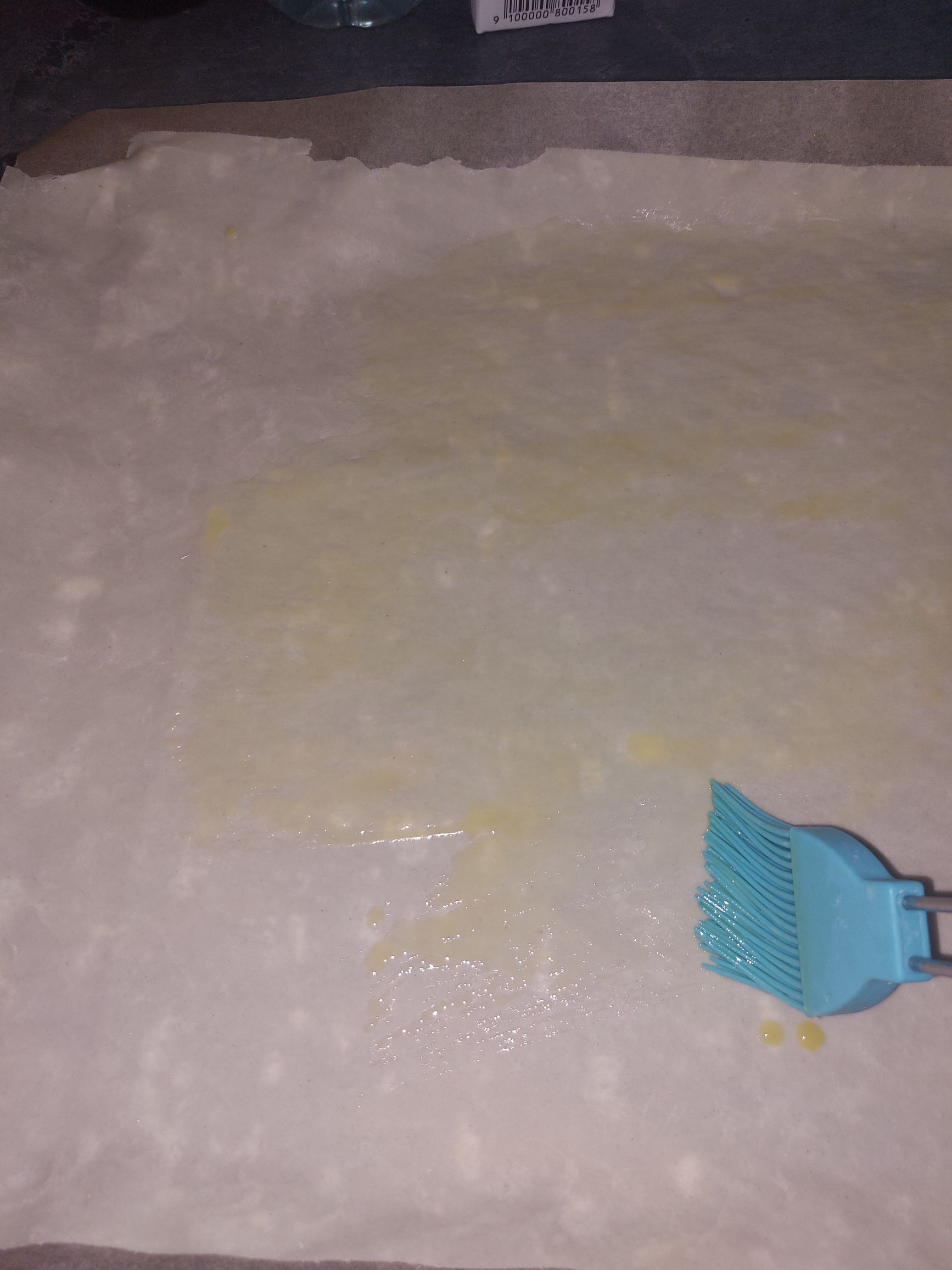 dva lista poližimo en poleg drugega da se prekrivat za 10 cm, namažemo z maslom, preko položimo drugi sloj testa