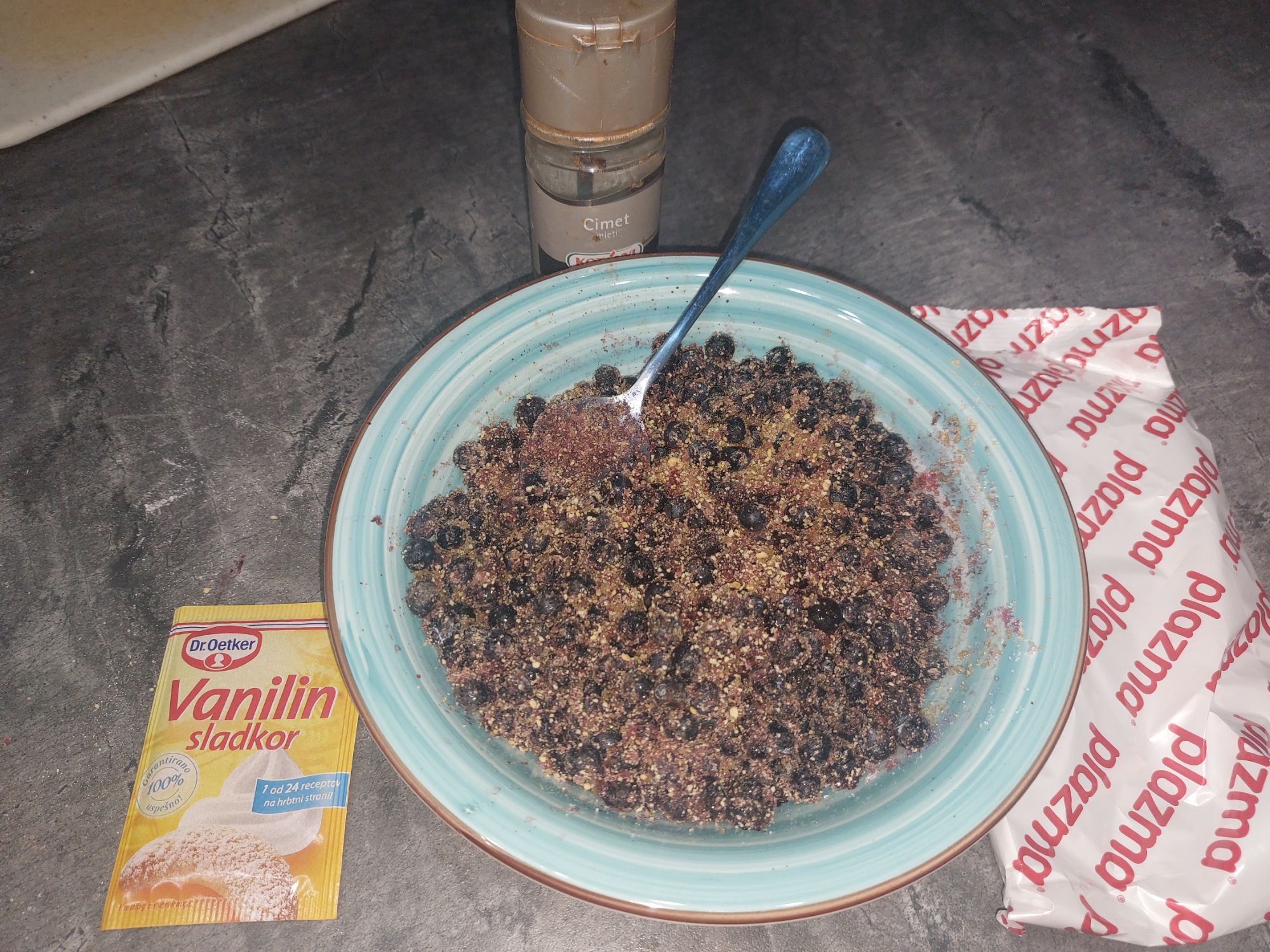 zmešamo borovnice, sladkor, vanilijev sladkor, cimet in limonino lupinico