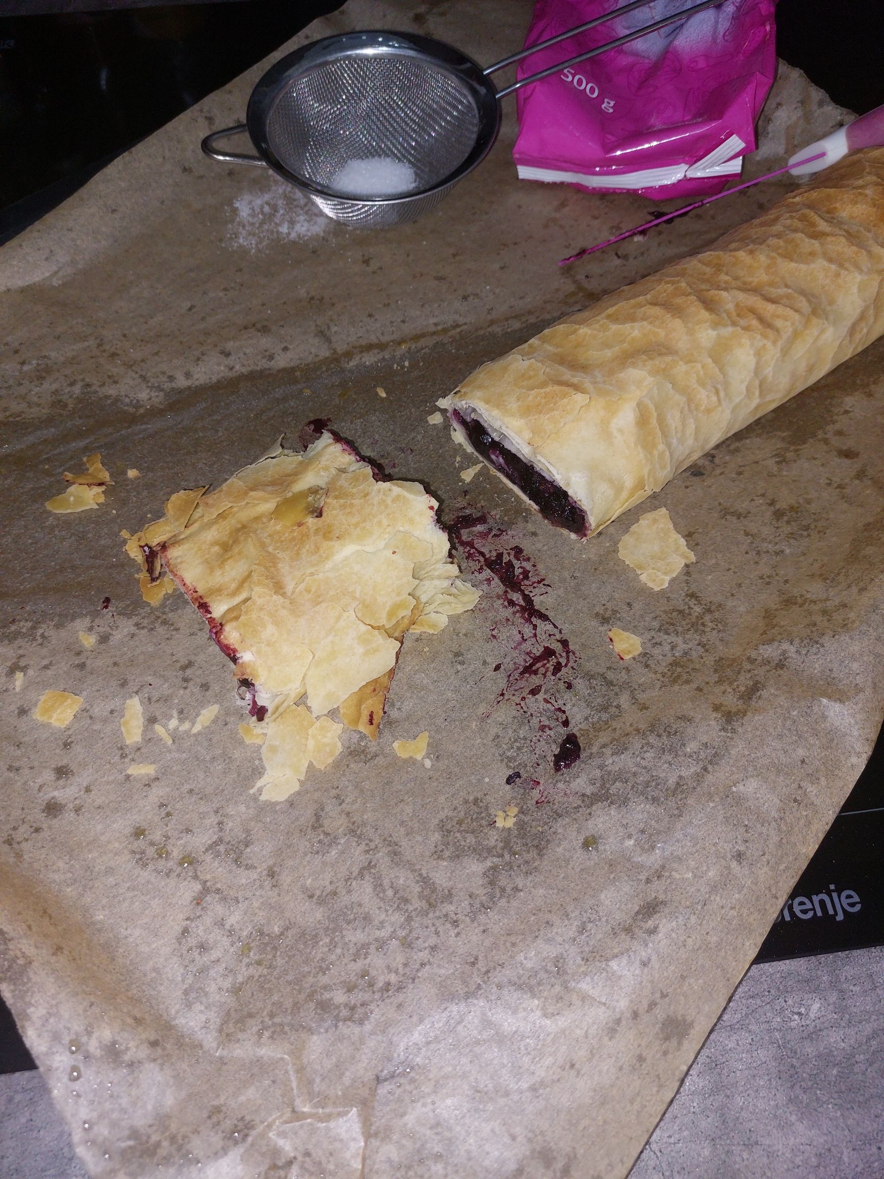 2 cm od spodnjega roba damo nadev, končamo levo in desno 2 cm od roba, potresemo s piškoti, levo in desno preklopimo testo, da nam ne bo uhajal nadev ven in s pomočjo podložene krpe začnemo zvijati