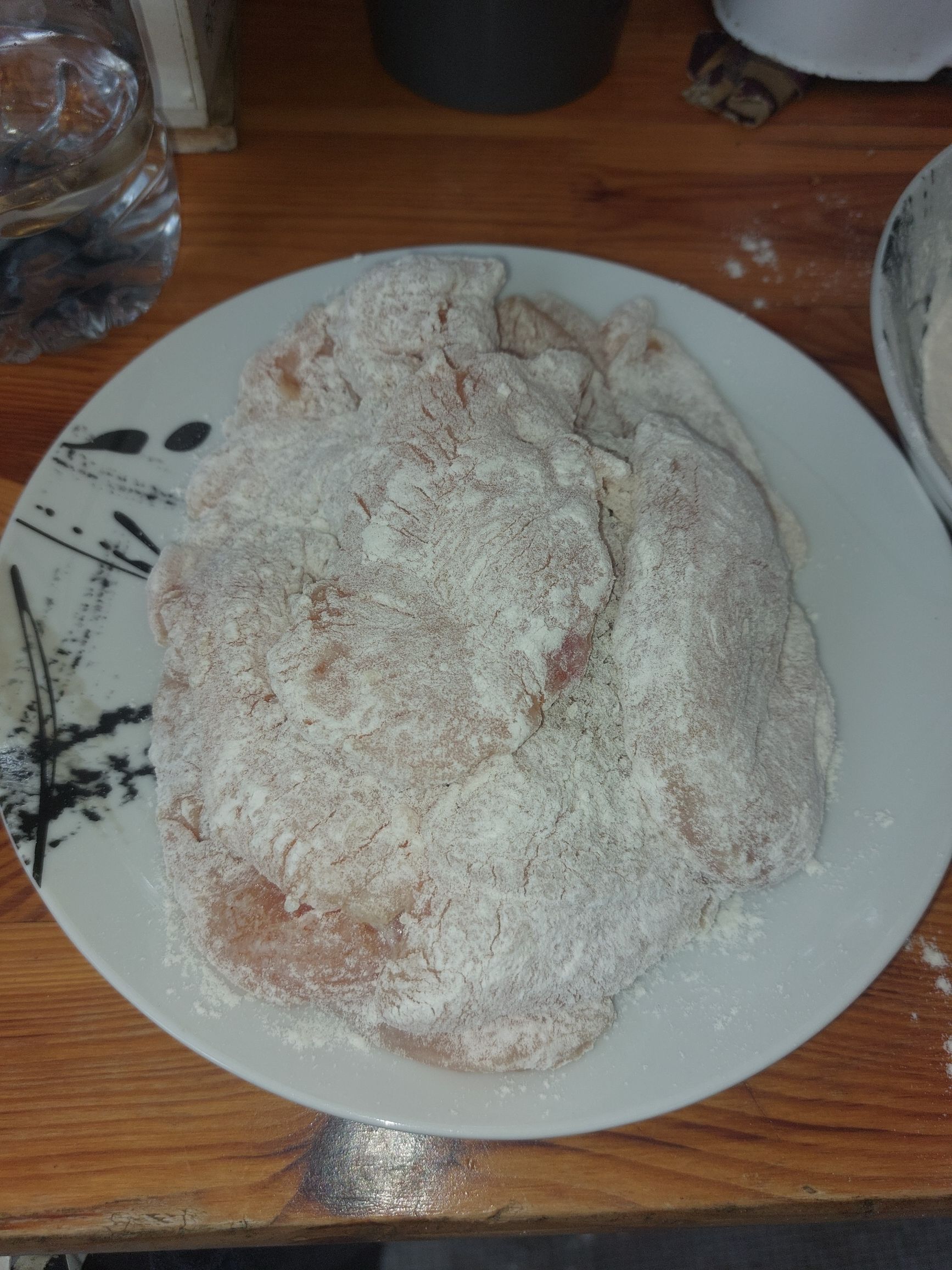 1. prsa povaljamo v moki, otresemo, damo v jajčno zmes in jih ocvremo ter shranimo na toplem