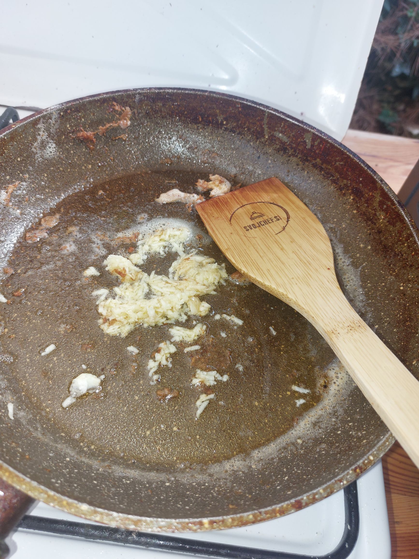 1. v ponvi na olivnem olju, na nizkem ognju počasi  pražimo česen