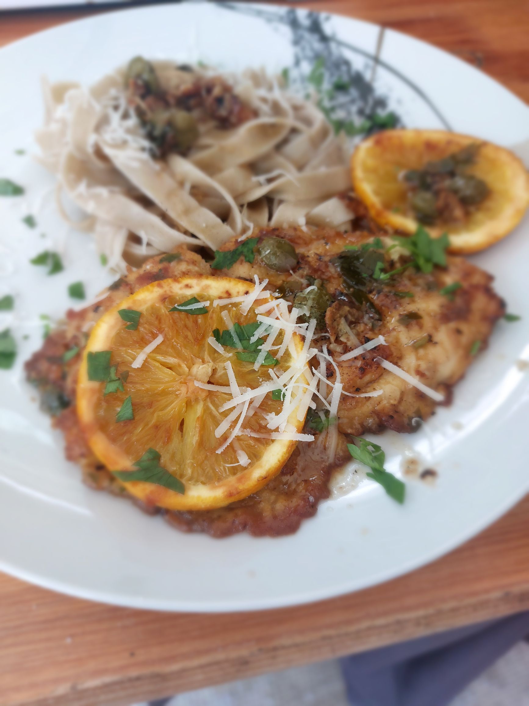1. na zmernem ognju kuhljamo 3-4 min, da malo povre, dodamo maslo in vrnemo piščanca ter limone in pomaranče, pregrejemo in serviramo